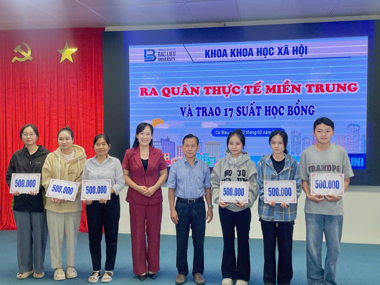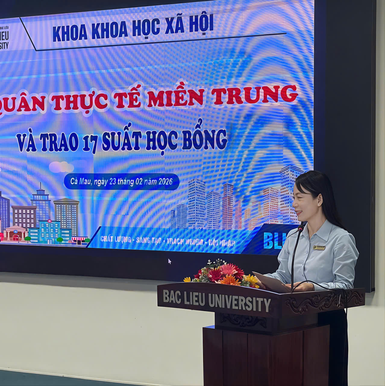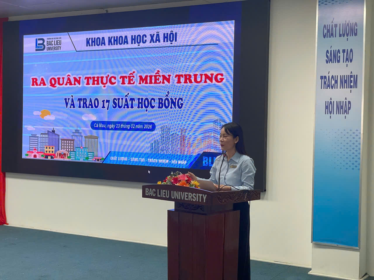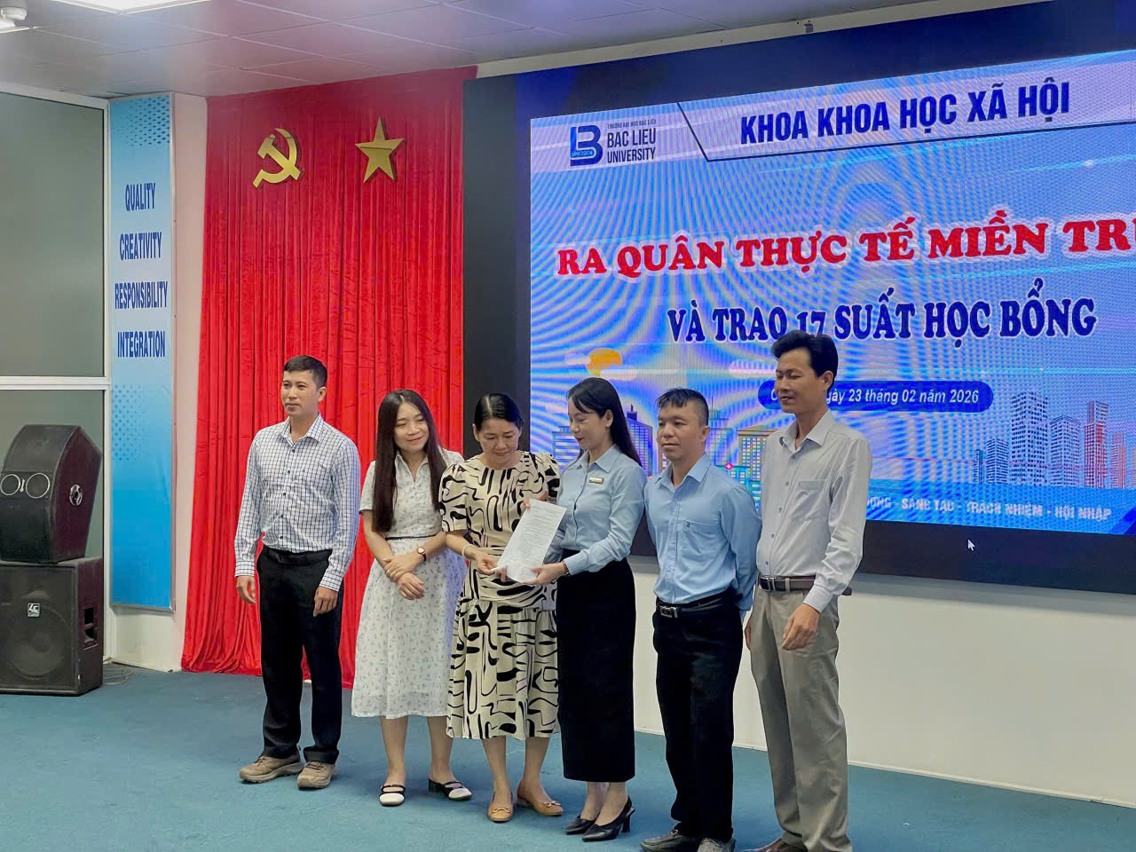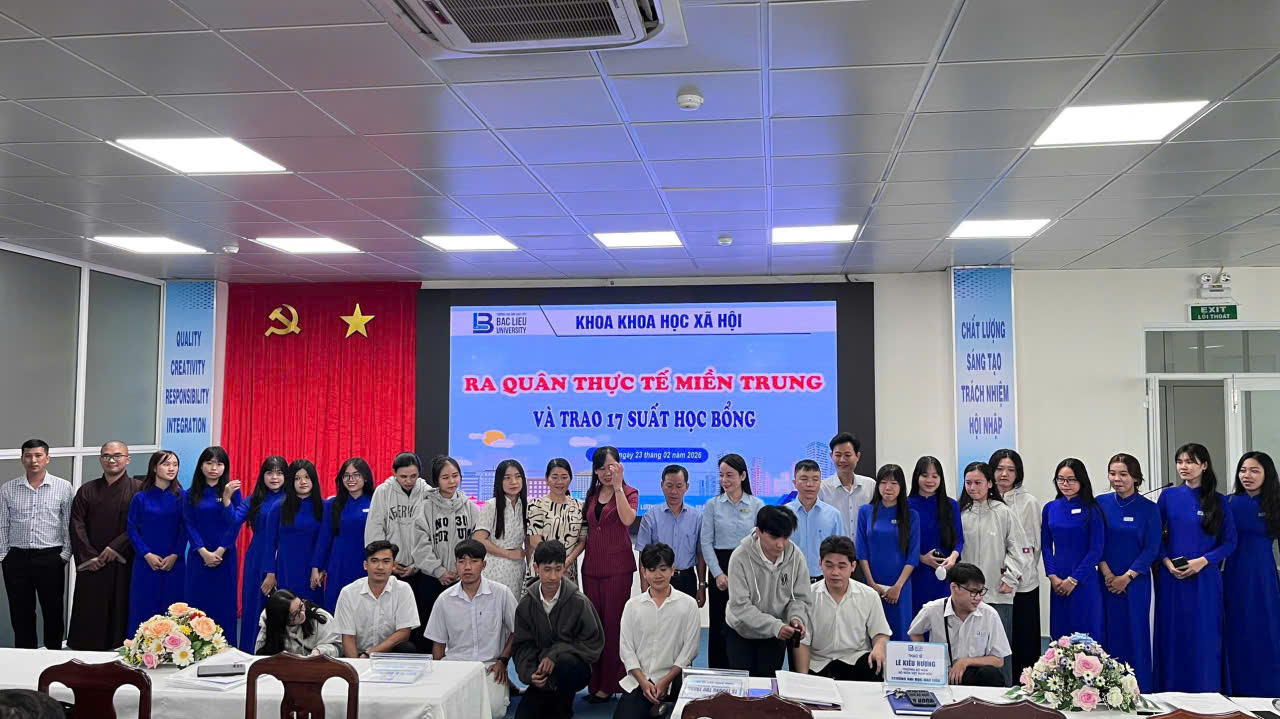 Sáng ngày 23/02/2026, tại Hội trường Nhà điều hành, Cơ sở 1, Trường Đại học Bạc Liêu, Khoa Khoa học xã hội đã tổ chức chương trình Ra quân thực tế miền Trung năm 2026 dành cho sinh viên các lớp 17DTVVHVN (ngành Tiếng Việt và Văn hóa Việt Nam), 17DTA1 và 17DTA2 (ngành Ngôn ngữ Anh).