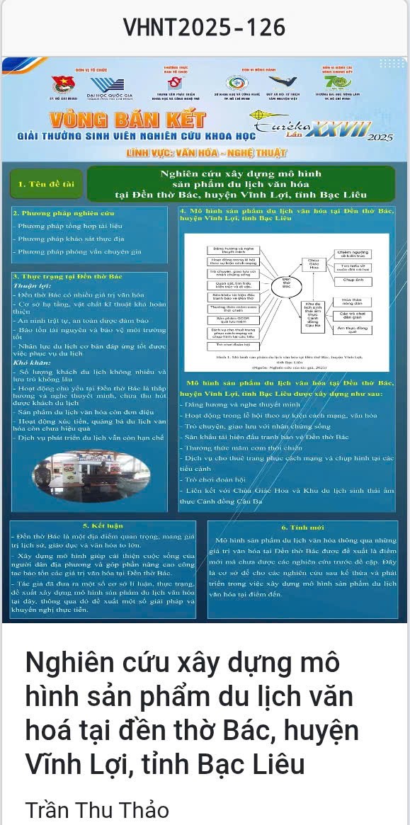 1. Đề tài: “Nghiên cứu xây dựng mô hình sản phẩm du lịch văn hóa tại Đền thờ Bác, huyện Vĩnh Lợi, tỉnh Bạc Liêu”