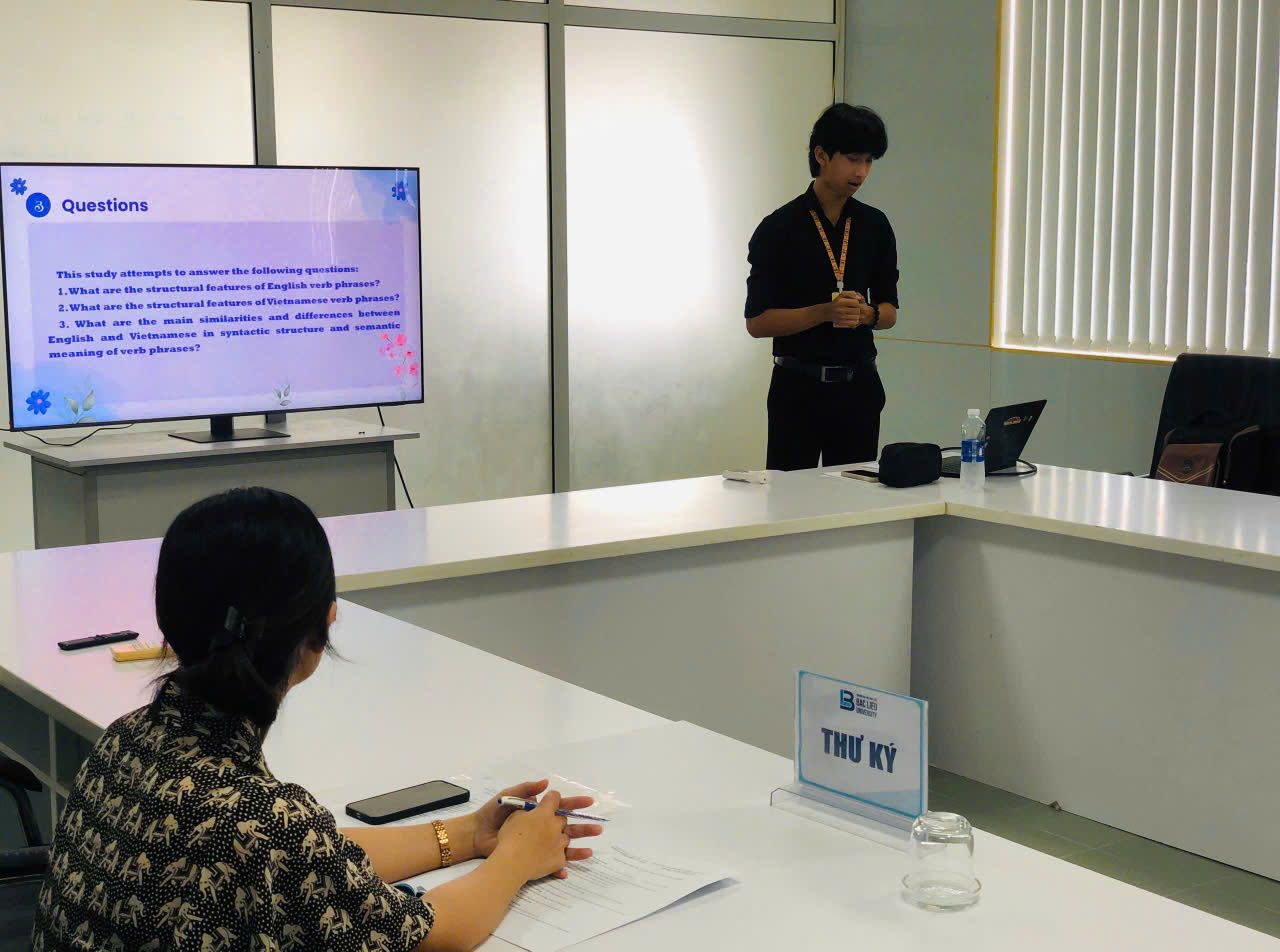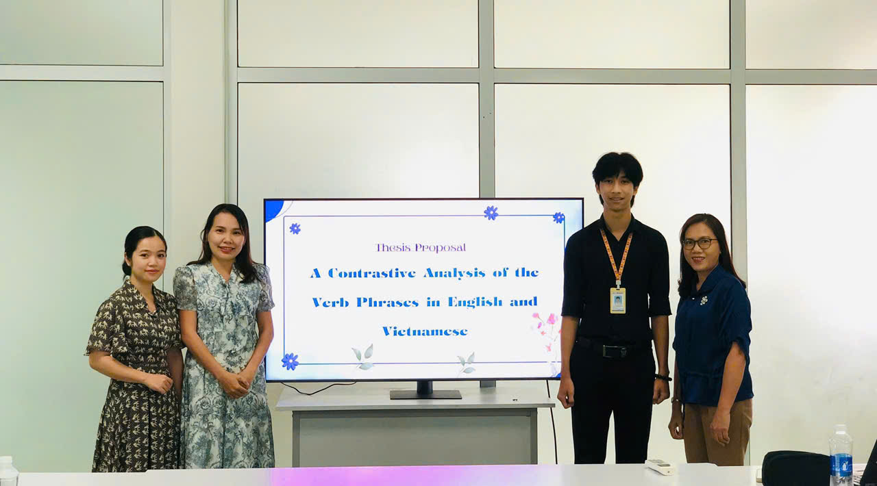 Chiều ngày 13/12/2025, tại Phòng họp số 1, Nhà điều hành (Cơ sở 1, Trường Đại học Bạc Liêu), Bộ môn Ngoại ngữ, Khoa Khoa học xã hội đã xét duyệt đề cương khoá luận tốt nghiệp năm học 2025-2026, cho sinh viên Nguyễn Quốc Bảo, lớp 16DTA1. - Tên đề tài: “A contrastive analysis of the verb phrases in English and Vietnamese” - Người hướng dẫn: ThS. Sầm Ngọc Khả Tú.