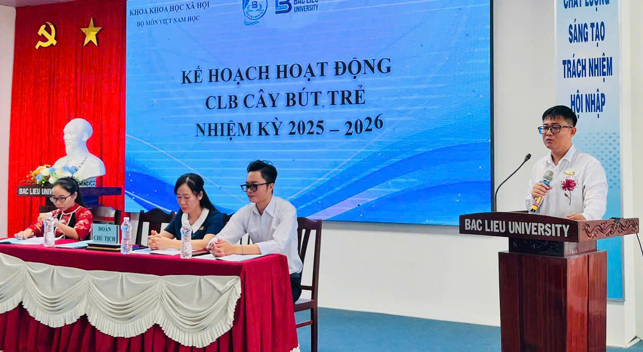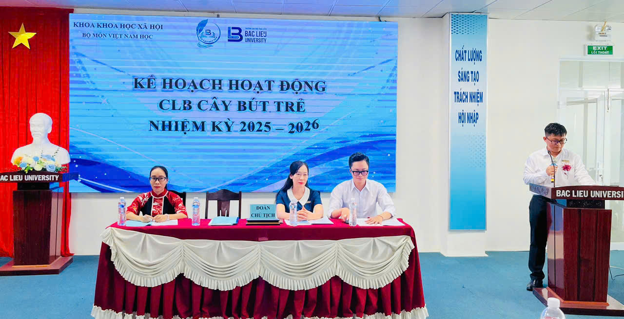 Sáng ngày 04/10/2025, tại Hội trường Nhà Điều hành – Trường Đại học Bạc Liêu, Câu lạc bộ (CLB) Cây bút trẻ trực thuộc Bộ môn Việt Nam học đã tổ chức Đại hội nhiệm kỳ 2025-2026. Sự kiện không chỉ đánh dấu một giai đoạn phát triển mới mà còn là dịp vinh danh những cá nhân có đóng góp nổi bật trong nhiệm kỳ vừa qua.