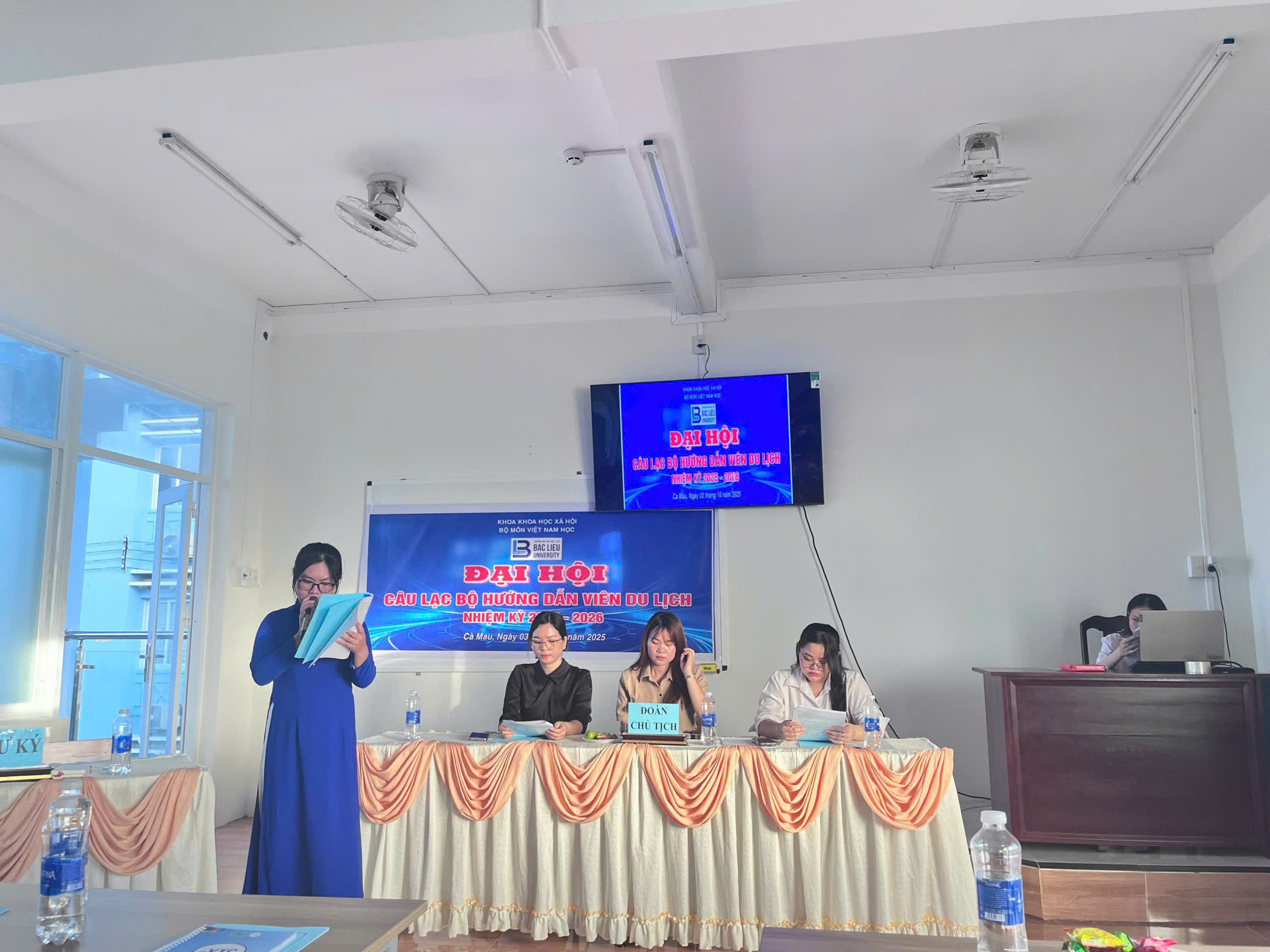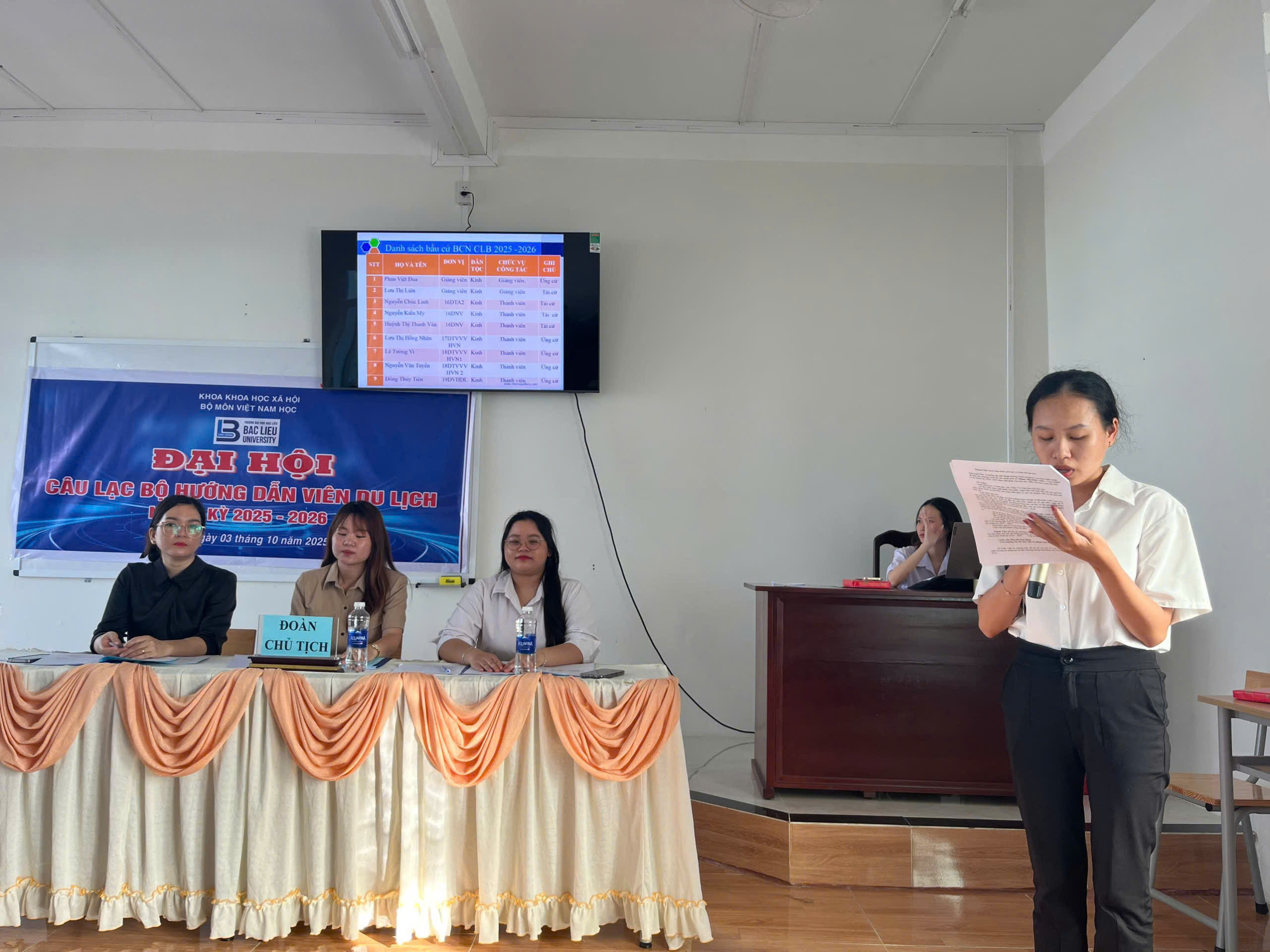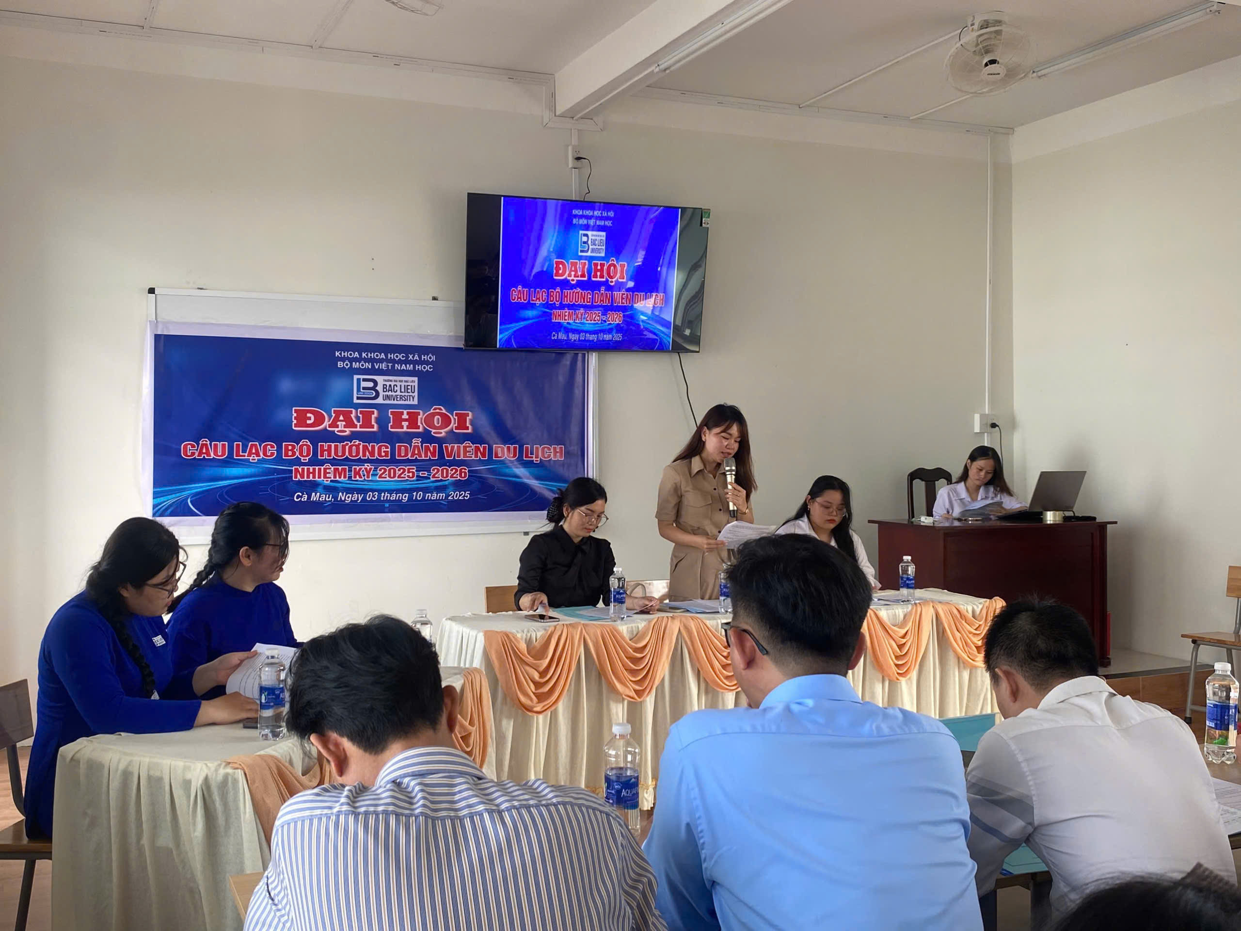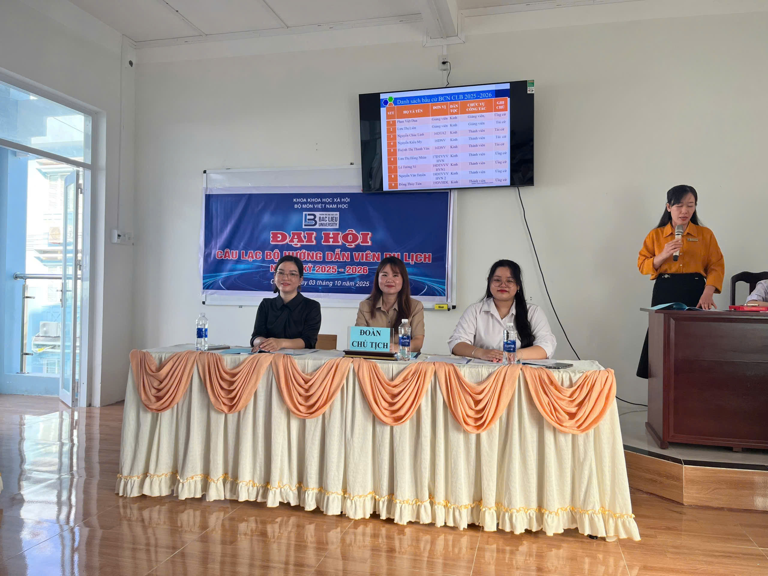Chiều ngày 03/10/2025, tại Phòng 18, Khoa Khoa học xã hội, Trường Đại học Bạc Liêu, Câu lạc bộ (CLB) Hướng dẫn viên du lịch đã long trọng tổ chức Đại hội nhiệm kỳ 2025–2026 nhằm tổng kết hoạt động trong nhiệm kỳ 2024–2025, đề ra phương hướng hoạt động mới và bầu Ban chủ nhiệm (BCN) nhiệm kỳ 2025–2026.