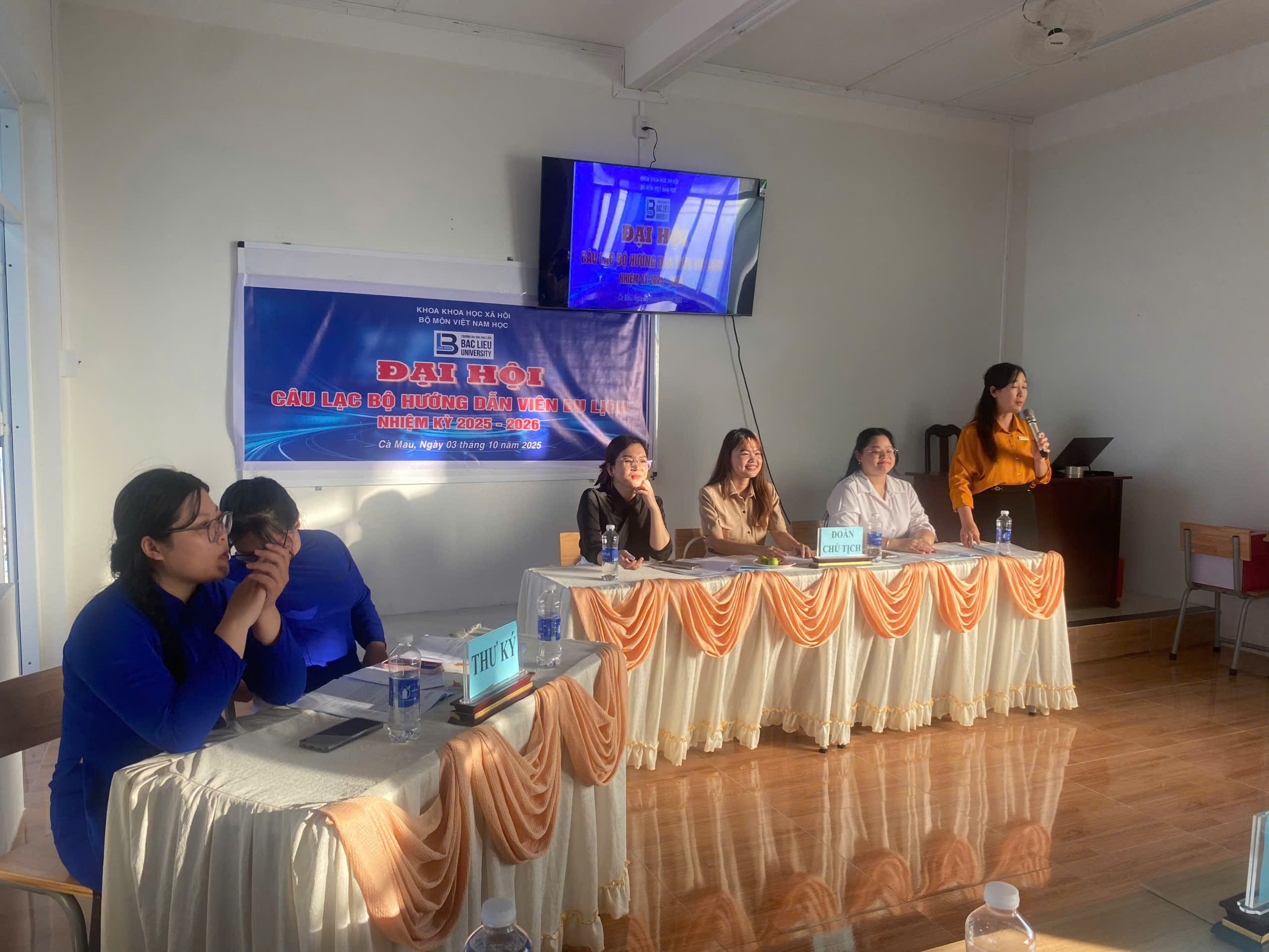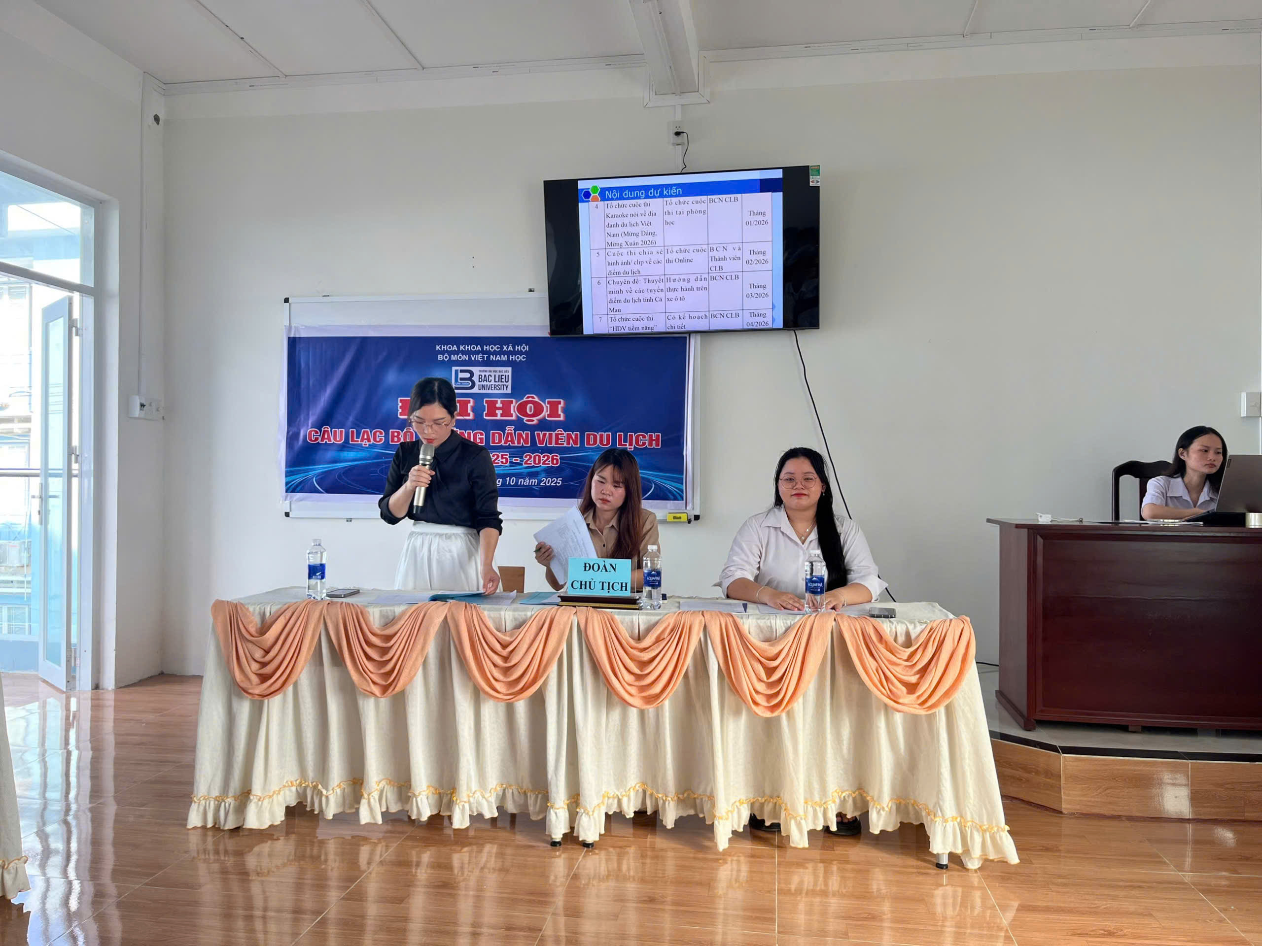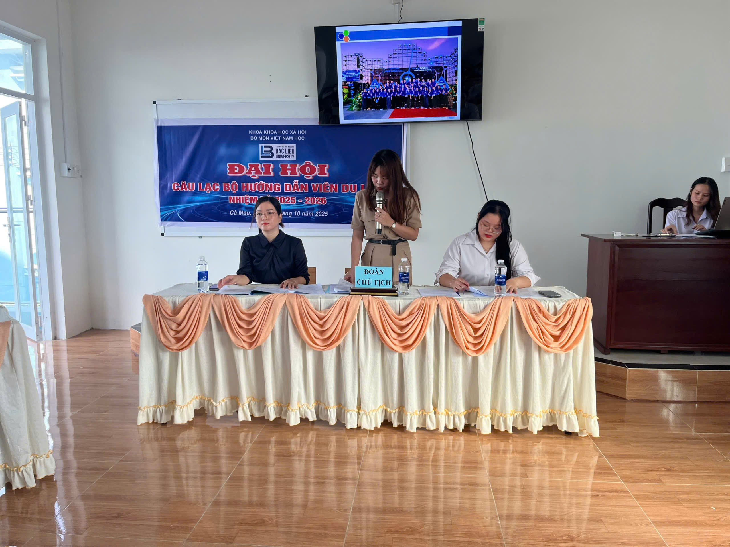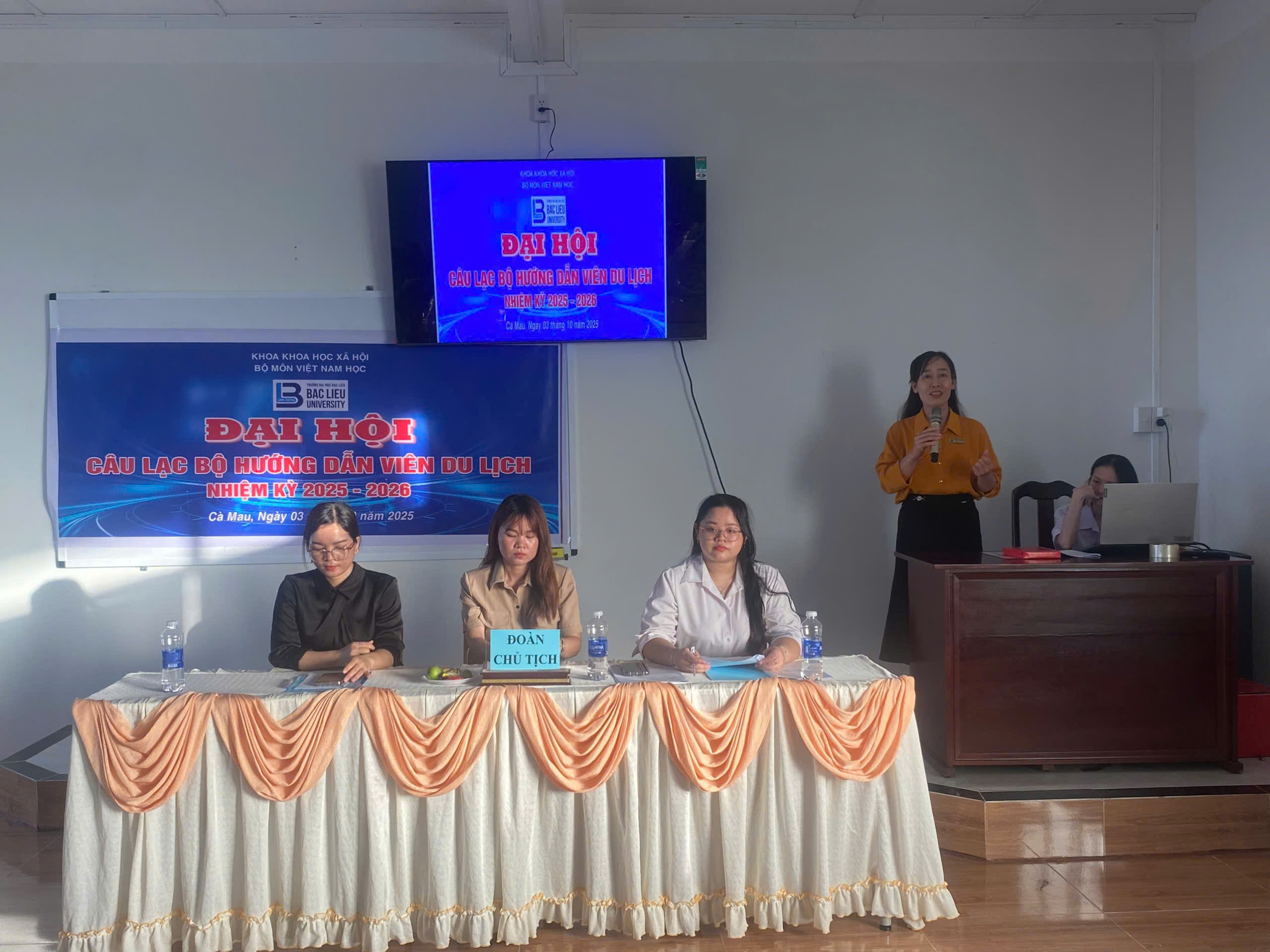 Chiều ngày 03/10/2025, tại Phòng 18, Khoa Khoa học xã hội, Trường Đại học Bạc Liêu, Câu lạc bộ (CLB) Hướng dẫn viên du lịch đã long trọng tổ chức Đại hội nhiệm kỳ 2025–2026 nhằm tổng kết hoạt động trong nhiệm kỳ 2024–2025, đề ra phương hướng hoạt động mới và bầu Ban chủ nhiệm (BCN) nhiệm kỳ 2025–2026.