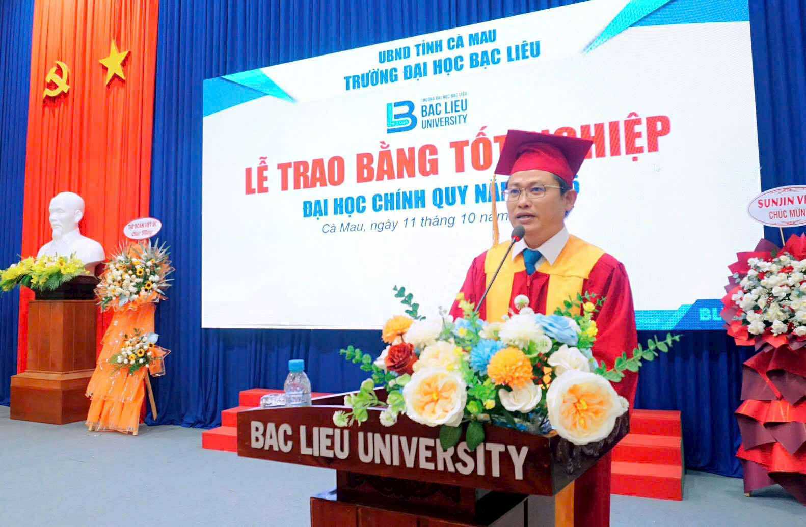 Phát biểu tại buổi lễ, TS. Phan Văn Đàn – Hiệu trưởng Nhà trường đã gửi lời chúc mừng nồng nhiệt đến các tân cử nhân, đồng thời biểu dương tinh thần trách nhiệm, nỗ lực vượt khó trong học tập và rèn luyện suốt thời gian qua. Tấm bằng tốt nghiệp hôm nay không chỉ ghi nhận kết quả học tập mà còn là sự kết tinh của tinh thần trách nhiệm, sự đồng hành giữa thầy và trò, giữa nhà trường, gia đình và doanh nghiệp. Nhân dịp này, Hiệu trưởng cũng bày tỏ lòng biết ơn sâu sắc đến gia đình các tân cử nhân đã tin tưởng lựa chọn và gửi gắm con em mình cho Trường Đại học Bạc Liêu.