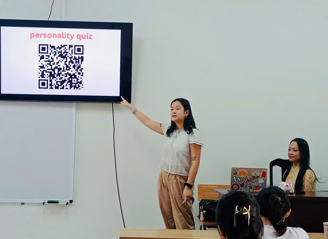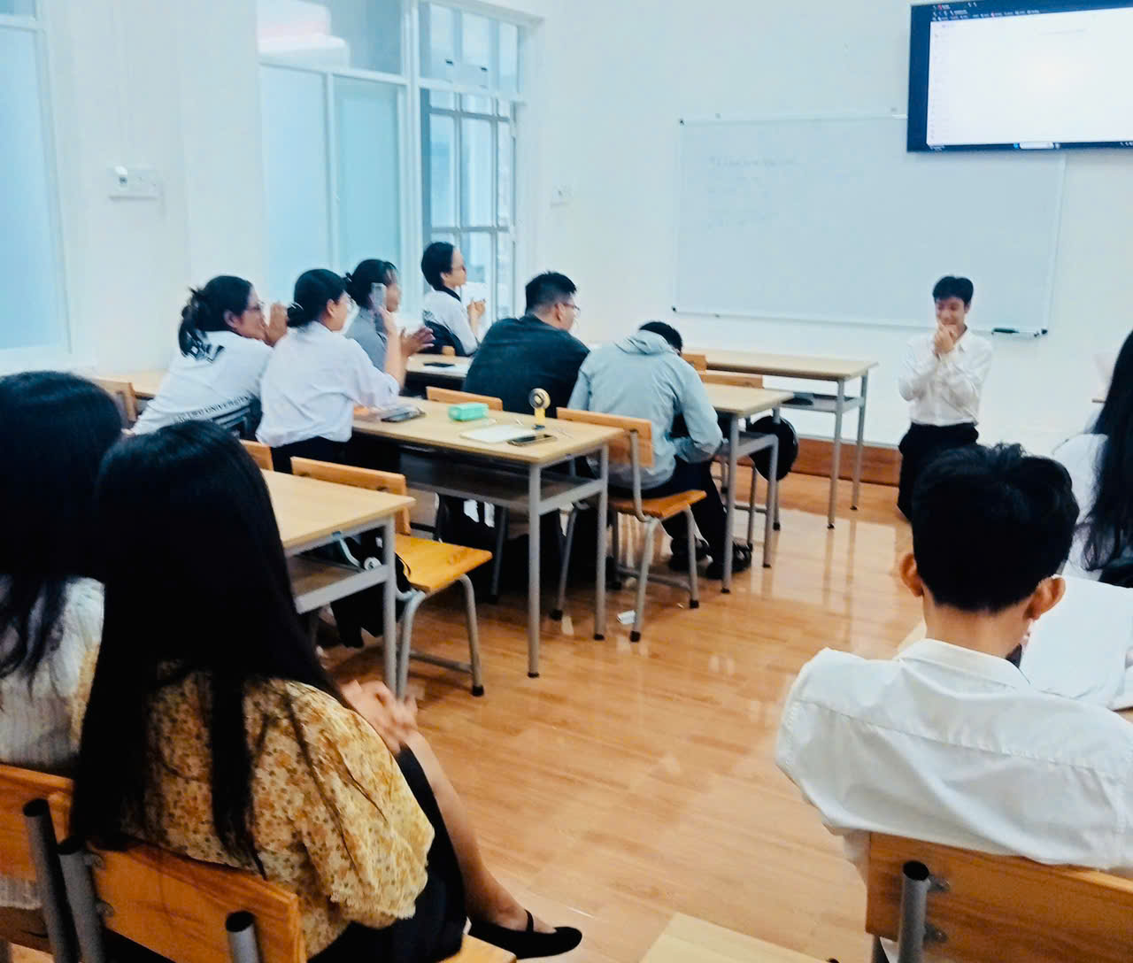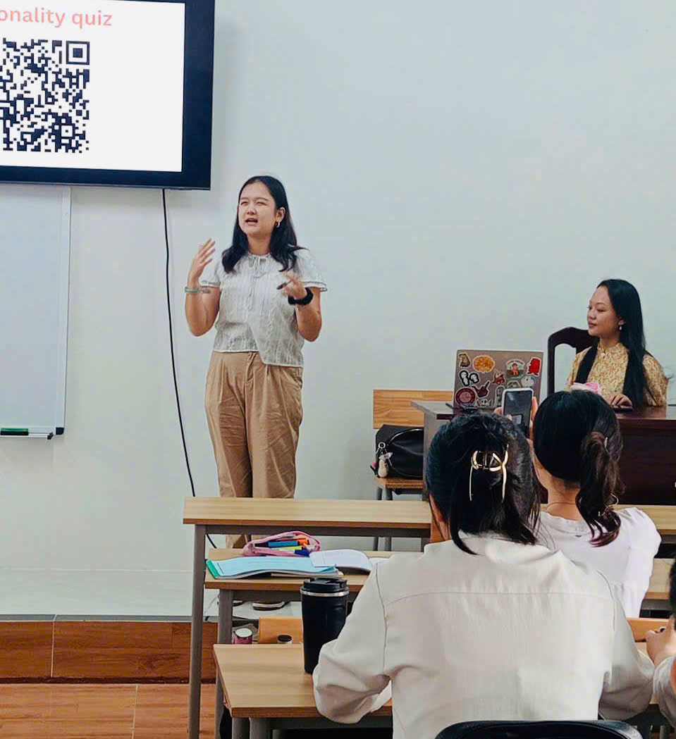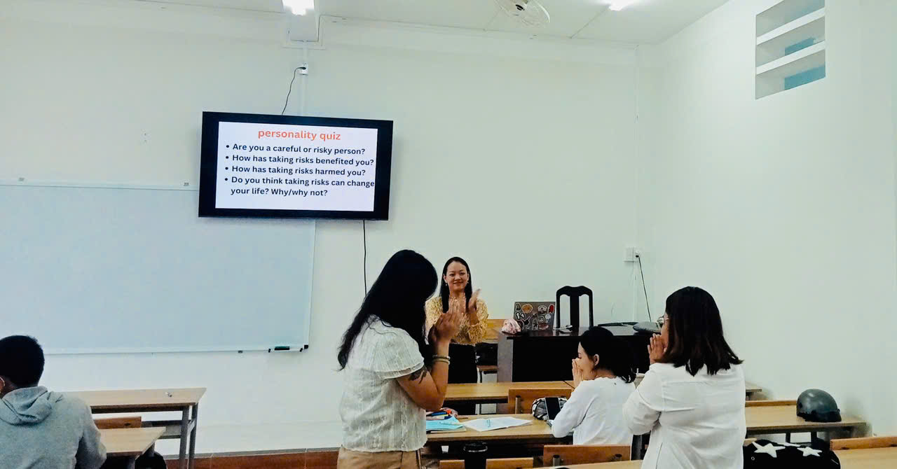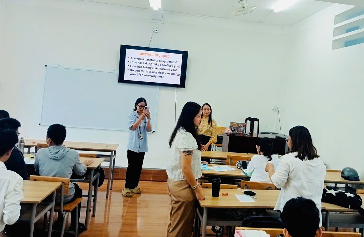 Điểm nhấn của chương trình là cả hai trợ giảng đã cùng phối hợp dẫn dắt một tiết học thú vị xoay quanh chủ đề “dám chấp nhận rủi ro”. Sinh viên tham gia thảo luận nhóm sôi nổi, chia sẻ quan điểm về lý do vì sao con người chấp nhận rủi ro và cách mà những rủi ro có thể định hình cuộc sống của chúng ta. Điểm đặc sắc của buổi học là hoạt động kể chuyện hợp tác, nơi cả lớp cùng nhau xây dựng những câu chuyện có nhân vật phải đưa ra những lựa chọn táo bạo. Qua đó, các bạn sinh viên không chỉ được thực hành tiếng Anh tự nhiên mà còn mở rộng góc nhìn về cuộc sống. Xuyên suốt bài học, sinh viên luôn nhiệt tình, hiếu kỳ và tham gia tích cực, hào hứng tương tác với Trợ giảng và sinh viên. Chuyến thăm của Cece đã mang đến nguồn năng lượng mới cho lớp học và tạo cơ hội để học sinh thực hành tiếng Anh với một giáo viên khác.