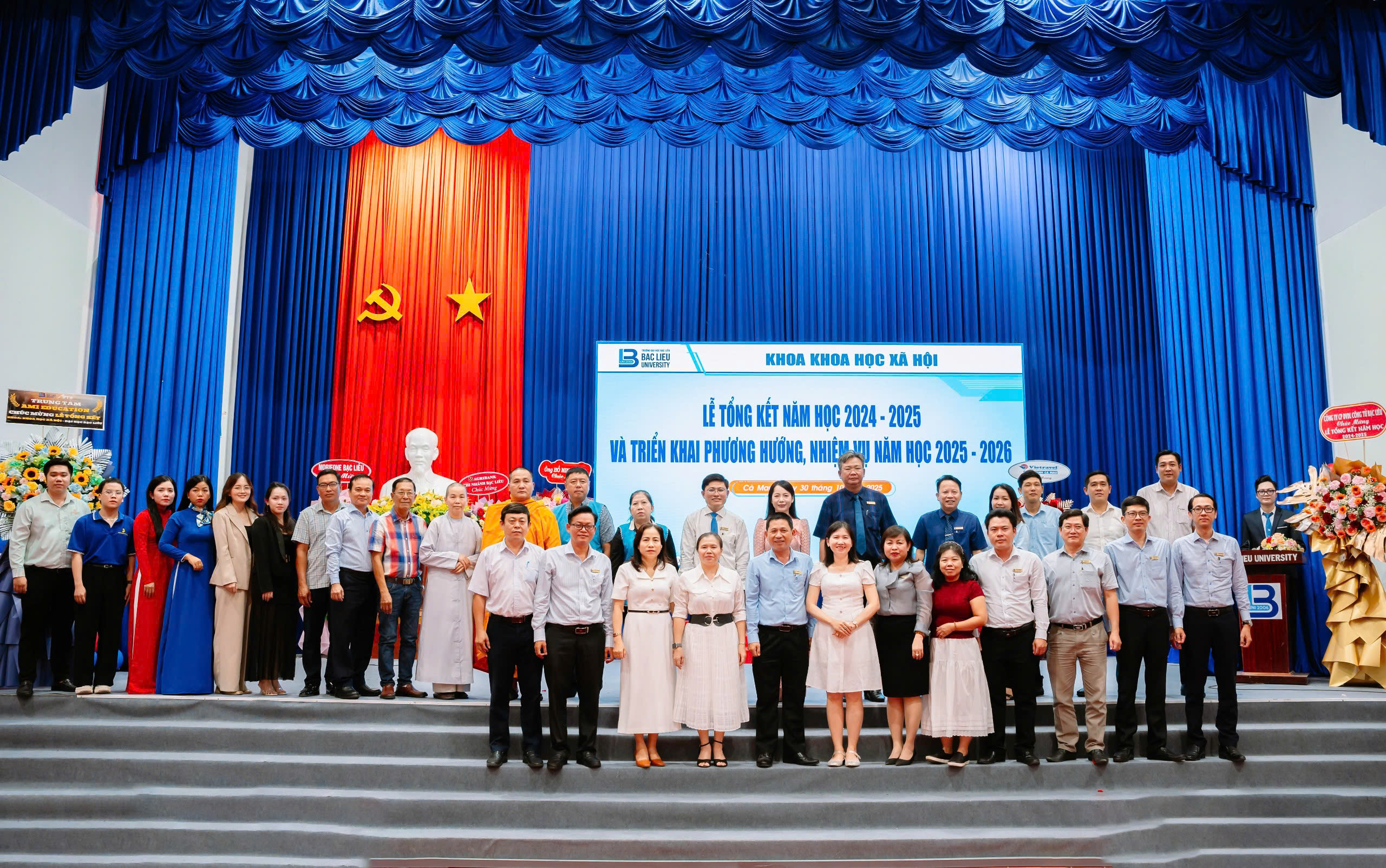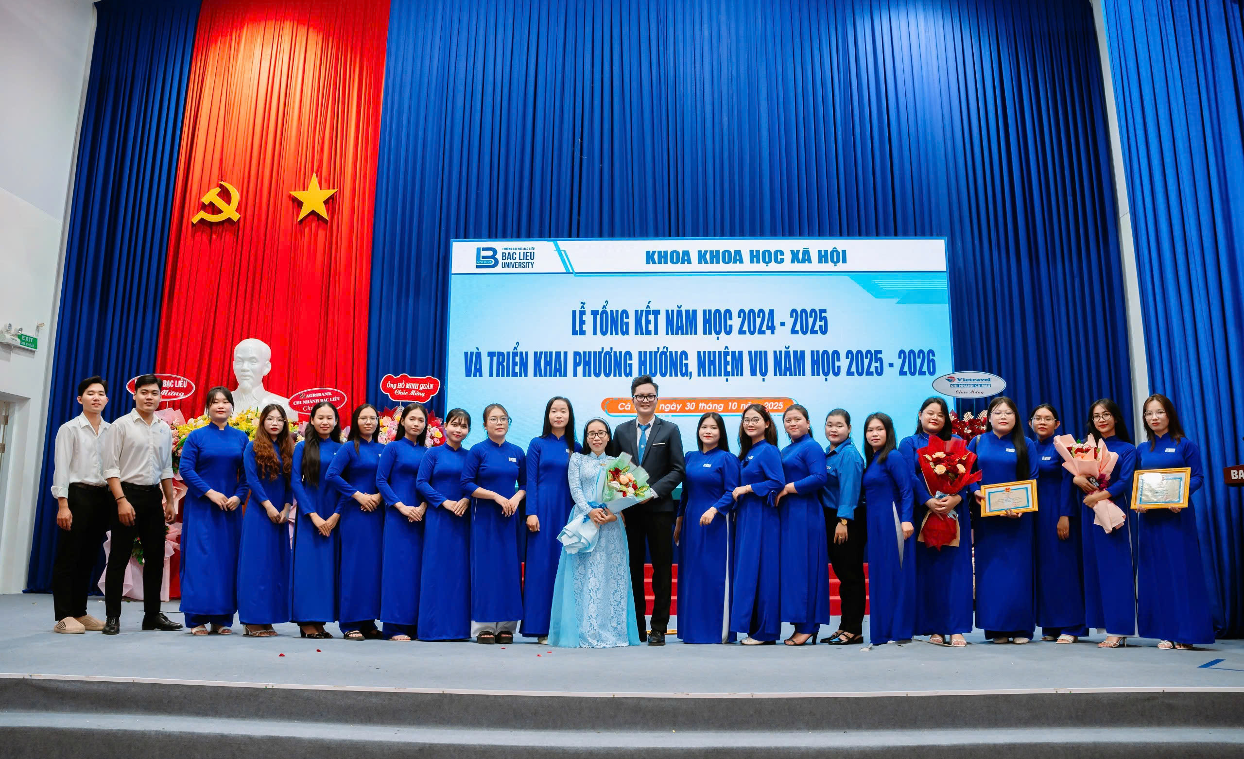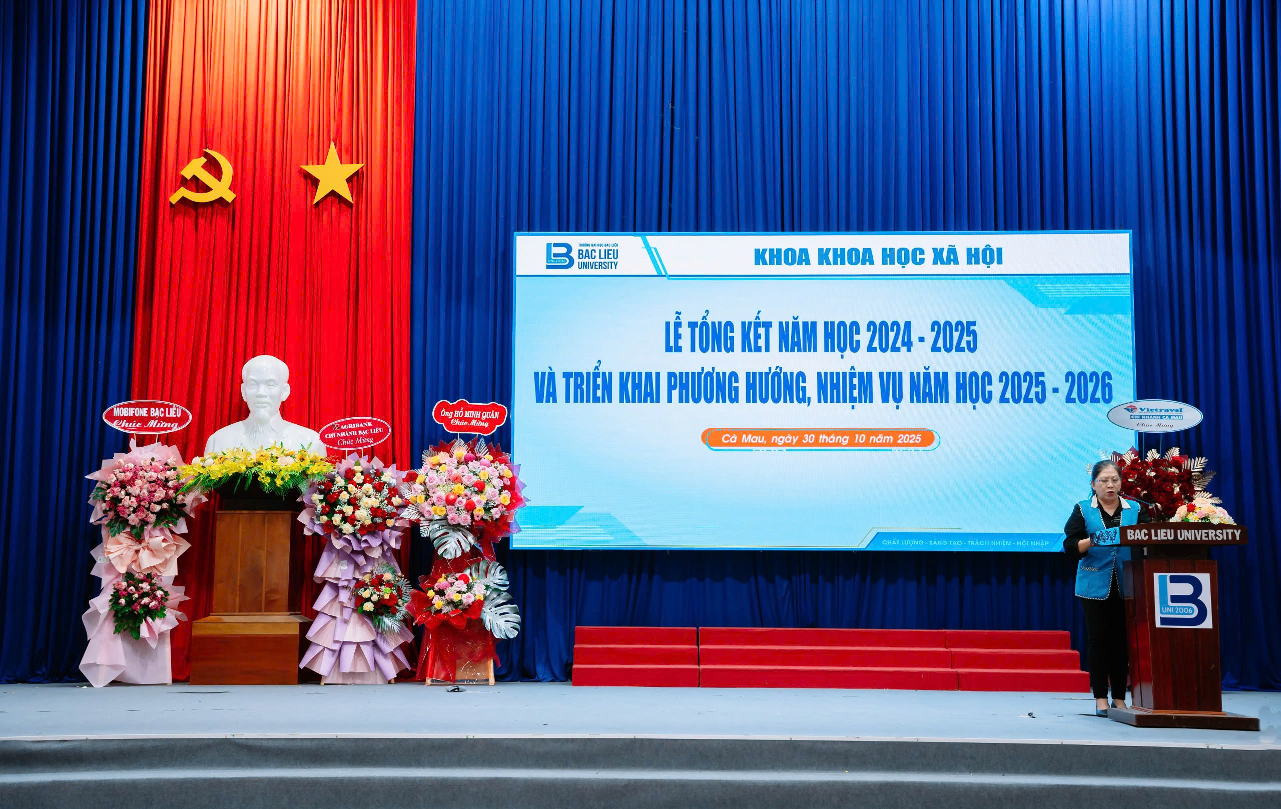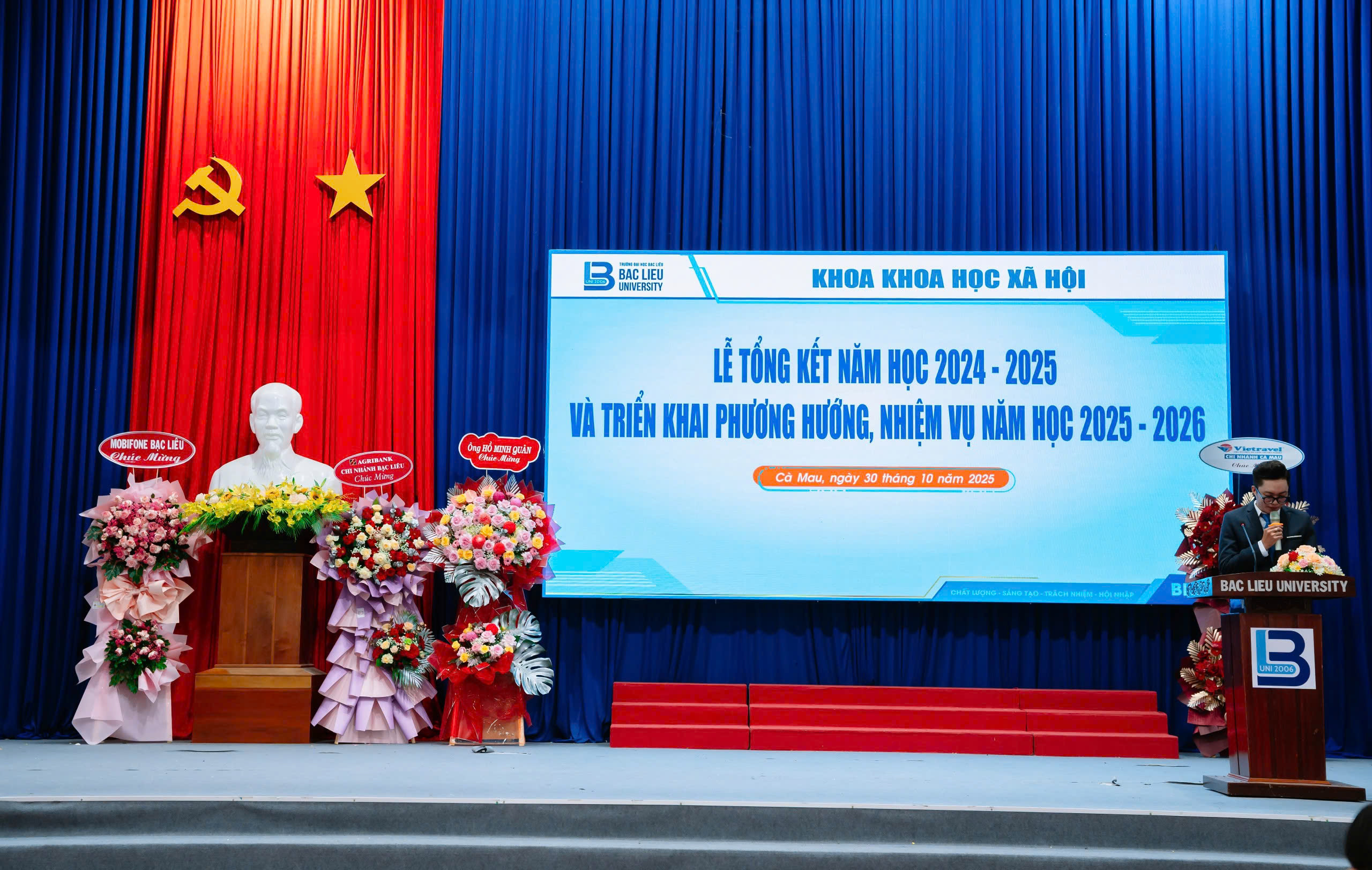 Chiều ngày 30/10/2025, tại Hội trường lớn Cơ sở 1 - Trường Đại học Bạc Liêu, Khoa Khoa học xã hội (KHXH) đã long trọng tổ chức Lễ tổng kết năm học 2024–2025 và triển khai phương hướng, nhiệm vụ năm học 2025–2026. Buổi lễ là dịp để tập thể Khoa nhìn lại những kết quả nổi bật trong công tác đào tạo, nghiên cứu khoa học và phục vụ cộng đồng; đồng thời bày tỏ lòng tri ân sâu sắc đến các đơn vị, cá nhân và doanh nghiệp đã đồng hành cùng sự phát triển của Khoa trong suốt năm học vừa qua.