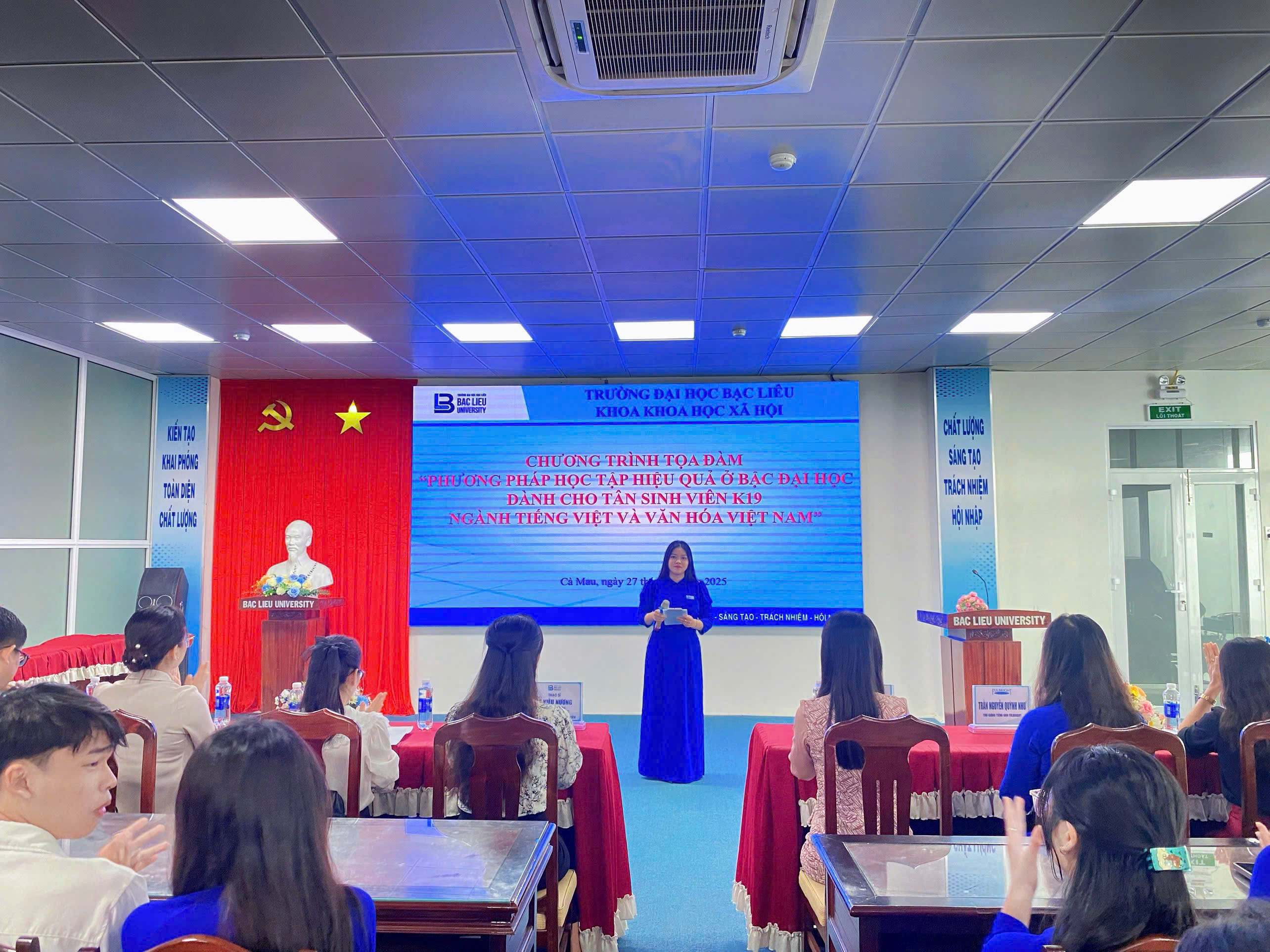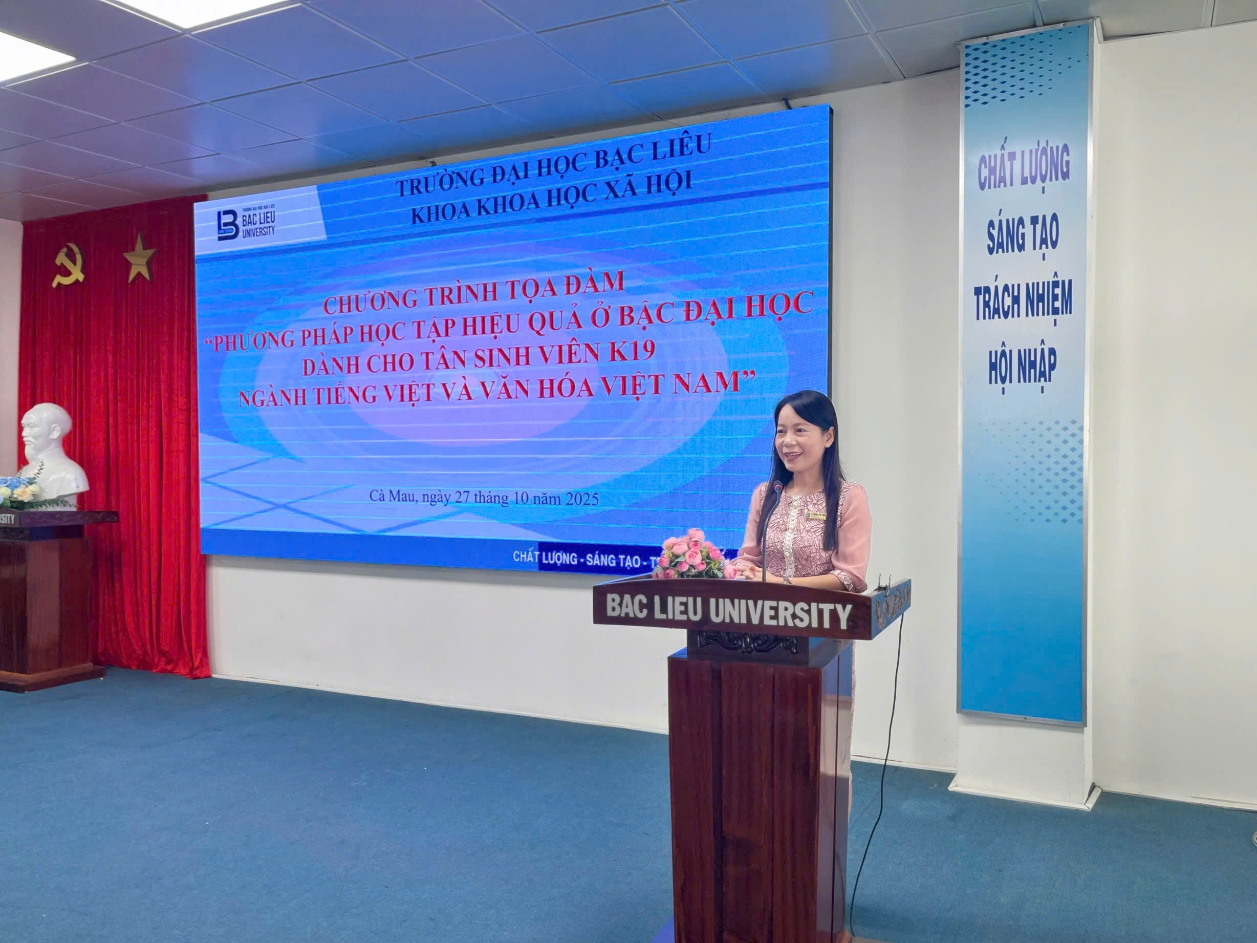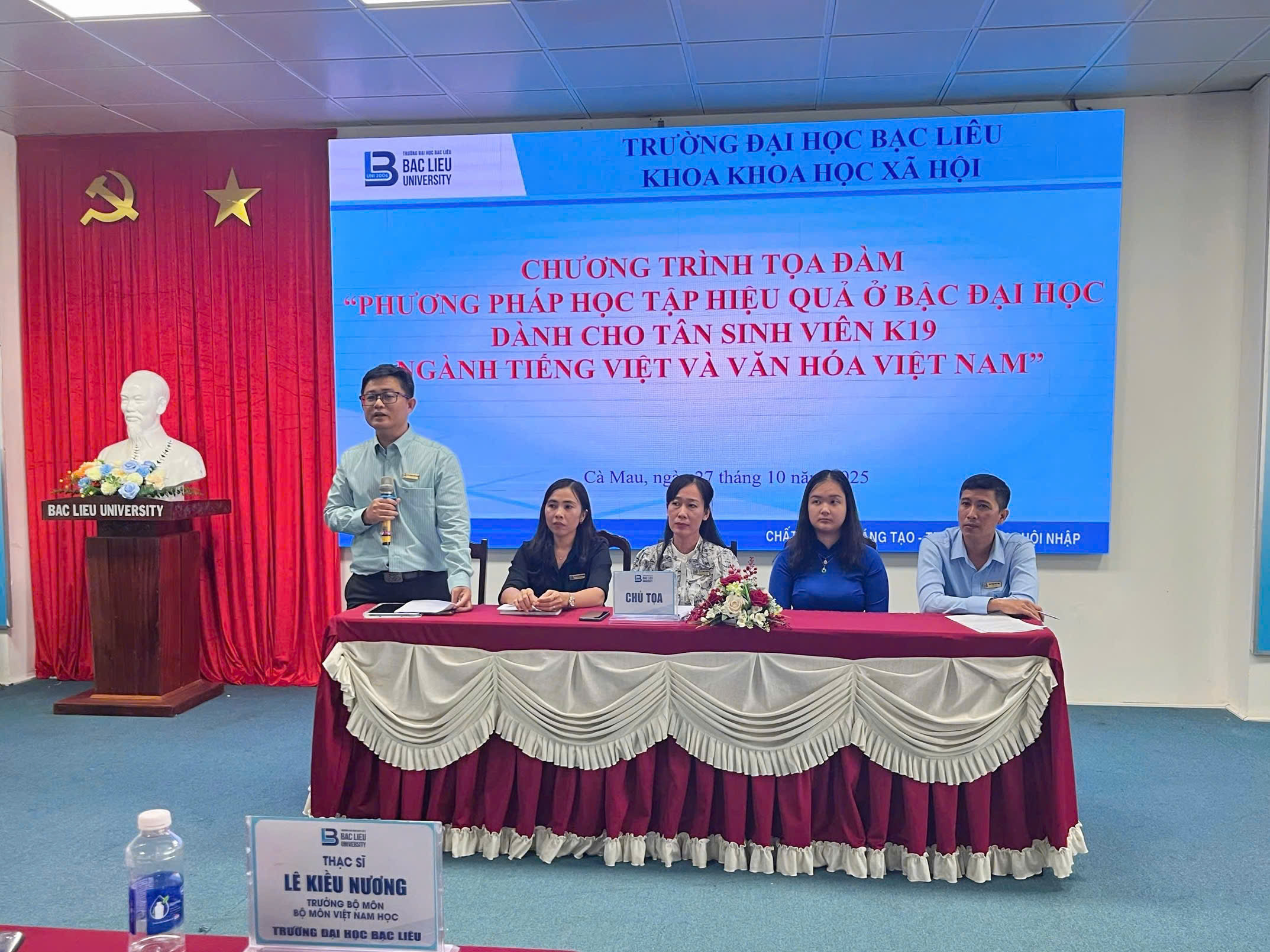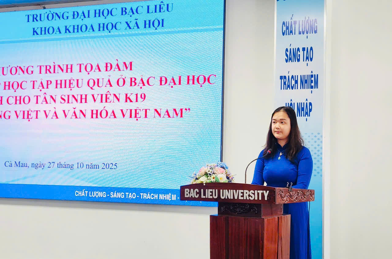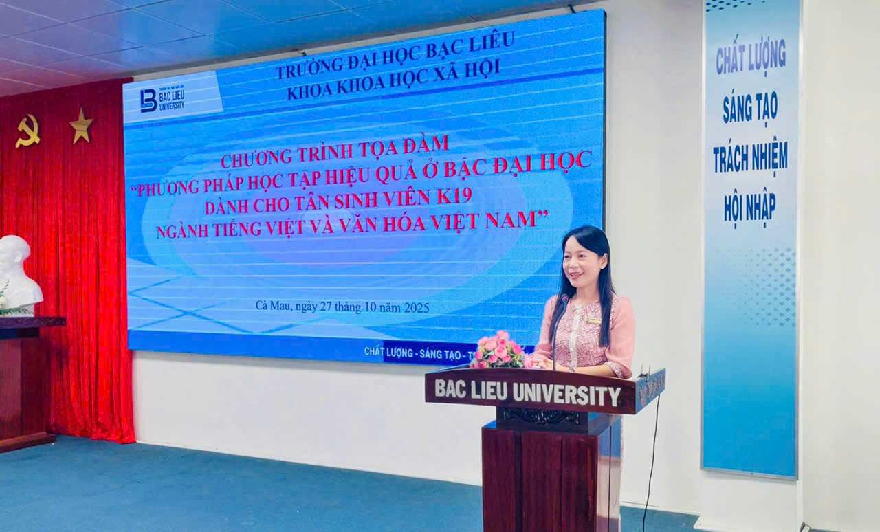 Sáng ngày 27/10/2025, tại Hội trường Nhà Điều hành (Cơ sở 1), Trường Đại học Bạc Liêu, Bộ môn Việt Nam học trực thuộc Khoa Khoa học xã hội, đã tổ chức buổi tọa đàm với chủ đề “Phương pháp học tập hiệu quả ở bậc đại học dành cho tân sinh viên ngành Tiếng Việt và Văn hóa Việt Nam”. Đây là hoạt động có ý nghĩa quan trọng, nhằm trang bị kịp thời các phương pháp học tập, kỹ năng mềm và tư duy tự chủ, giúp hơn 100 tân sinh viên K19 tự tin định hướng và hòa nhập thành công vào môi trường học tập mới.