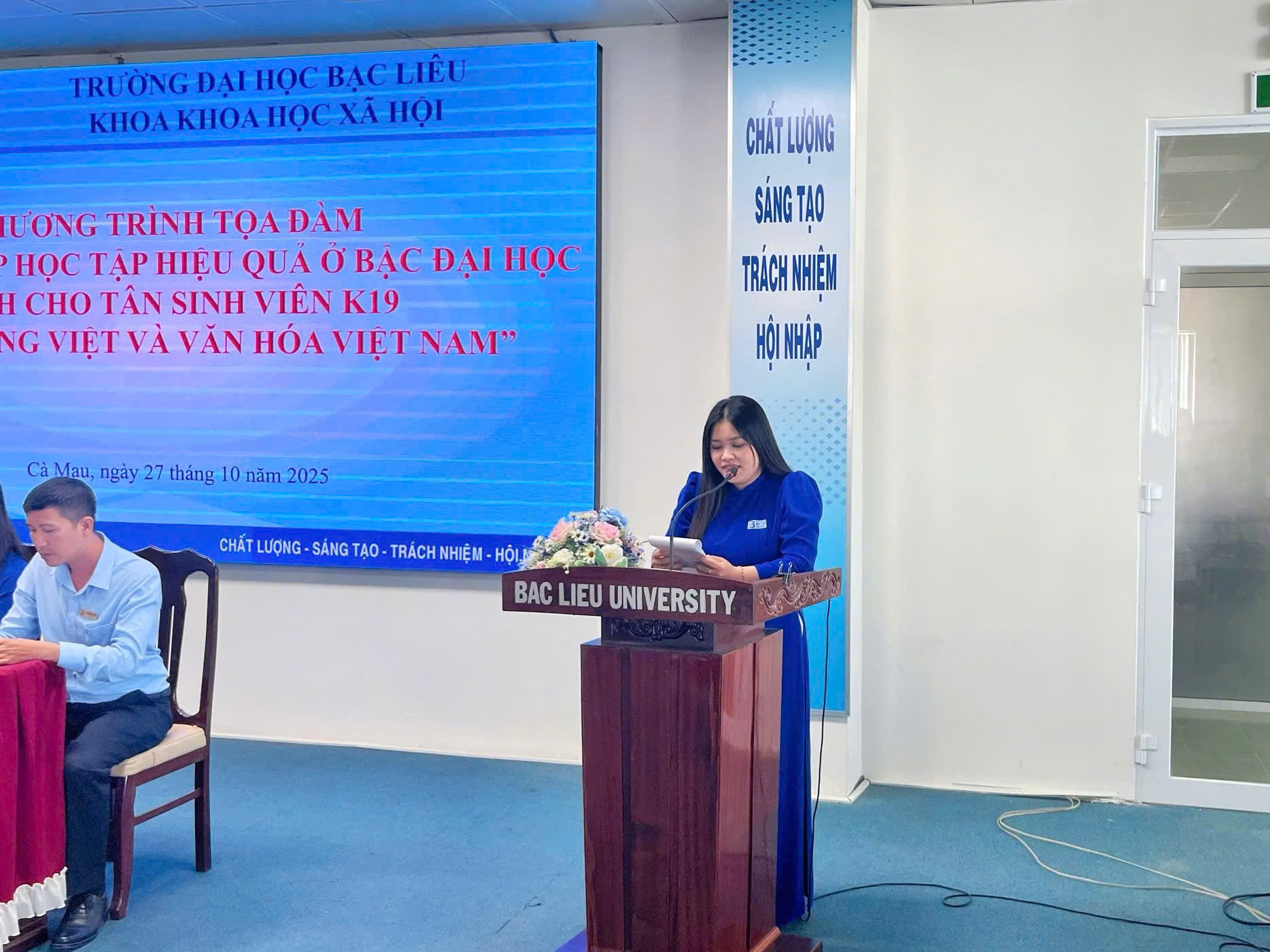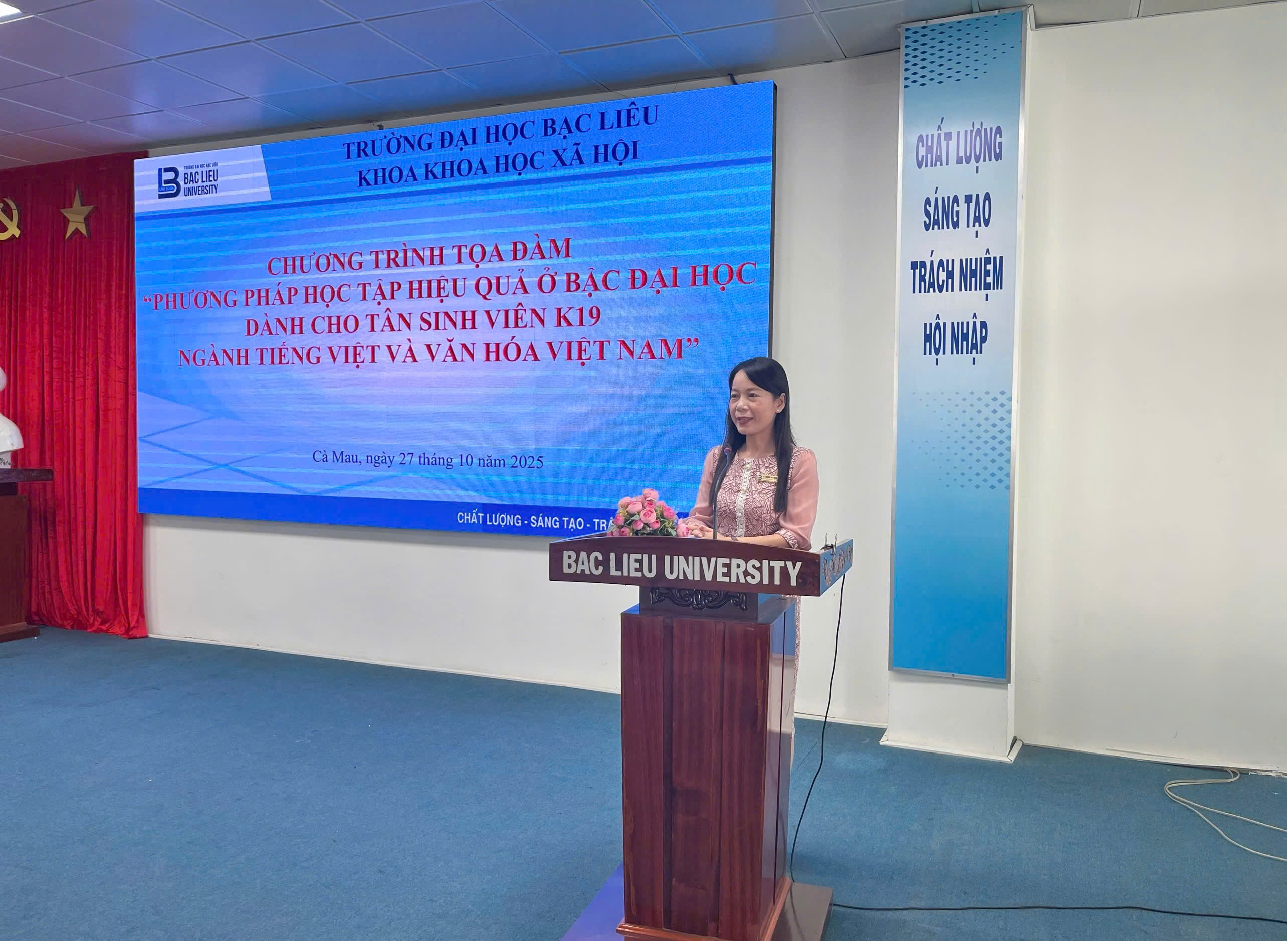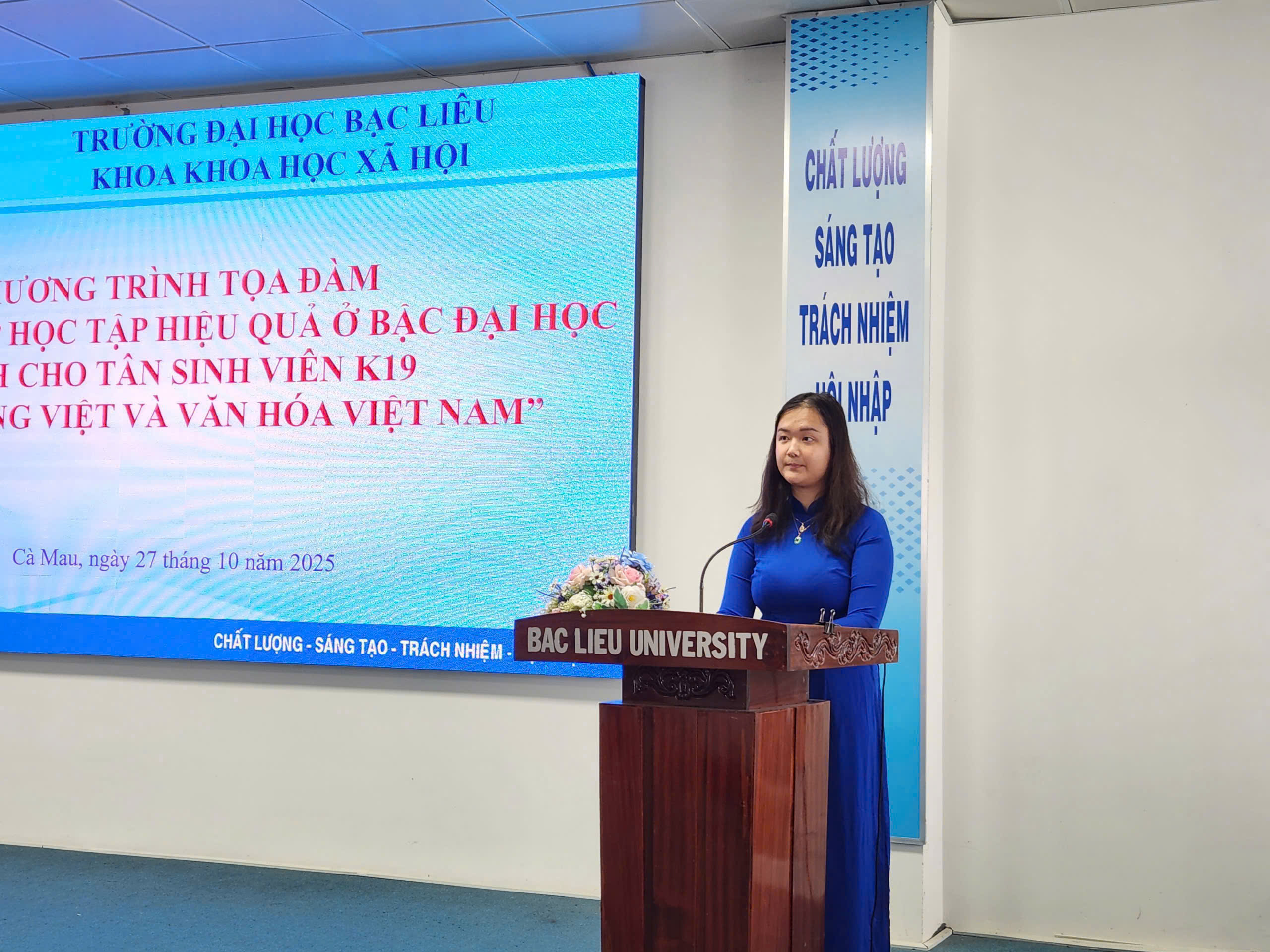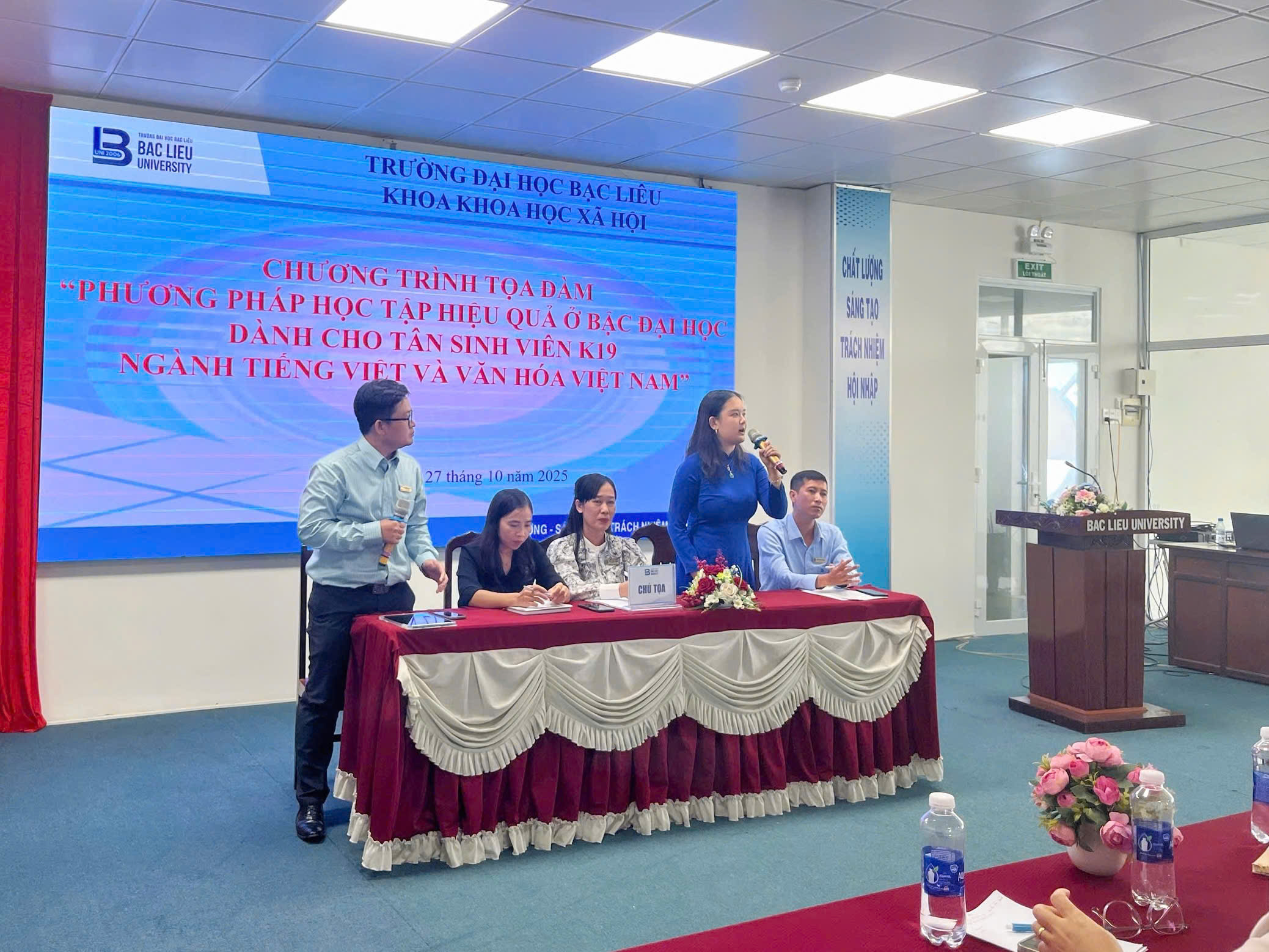 Sáng ngày 27/10/2025, tại Hội trường Nhà Điều hành (Cơ sở 1), Trường Đại học Bạc Liêu, Bộ môn Việt Nam học trực thuộc Khoa Khoa học xã hội, đã tổ chức buổi tọa đàm với chủ đề “Phương pháp học tập hiệu quả ở bậc đại học dành cho tân sinh viên ngành Tiếng Việt và Văn hóa Việt Nam”. Đây là hoạt động có ý nghĩa quan trọng, nhằm trang bị kịp thời các phương pháp học tập, kỹ năng mềm và tư duy tự chủ, giúp hơn 100 tân sinh viên K19 tự tin định hướng và hòa nhập thành công vào môi trường học tập mới.