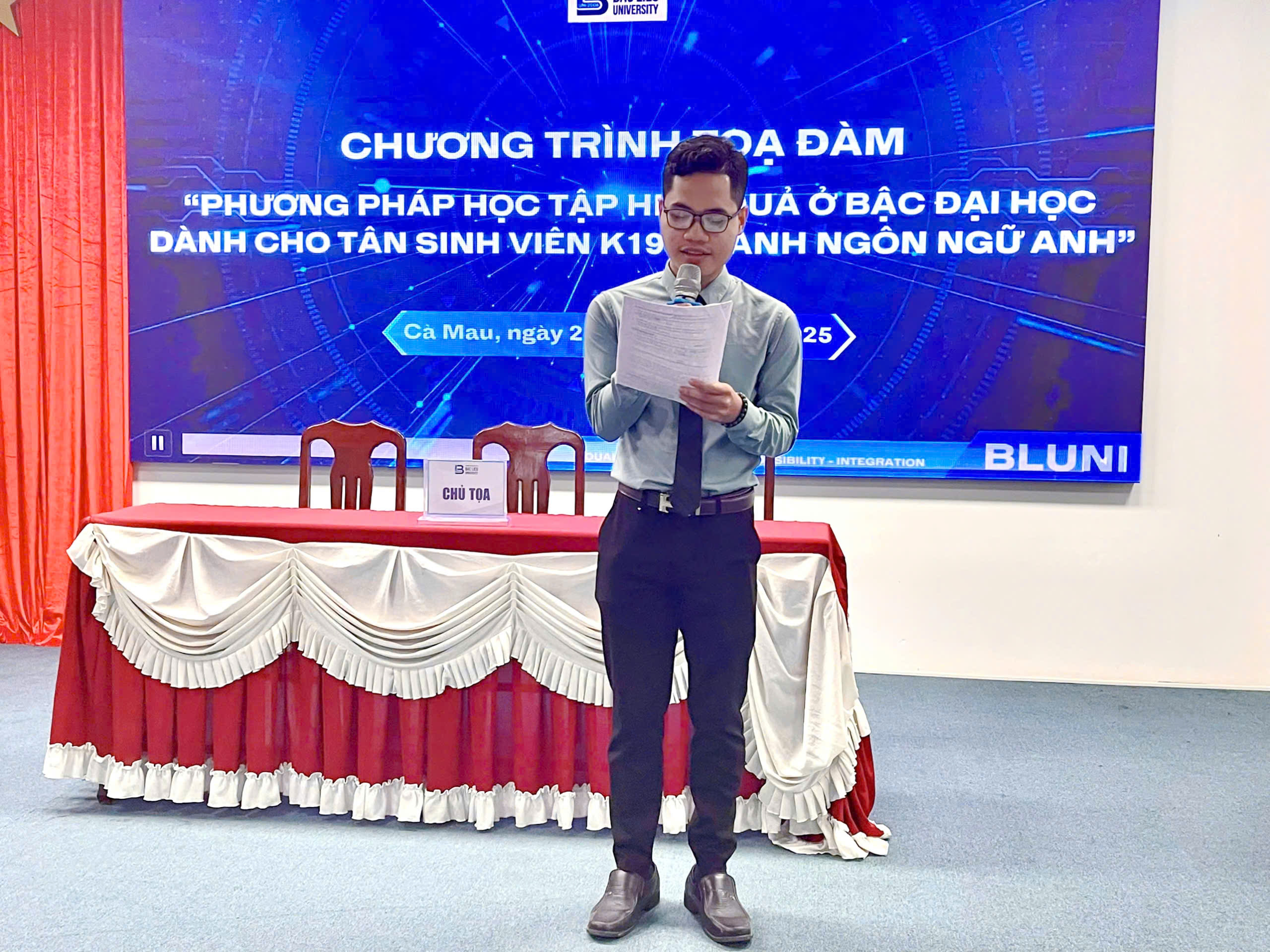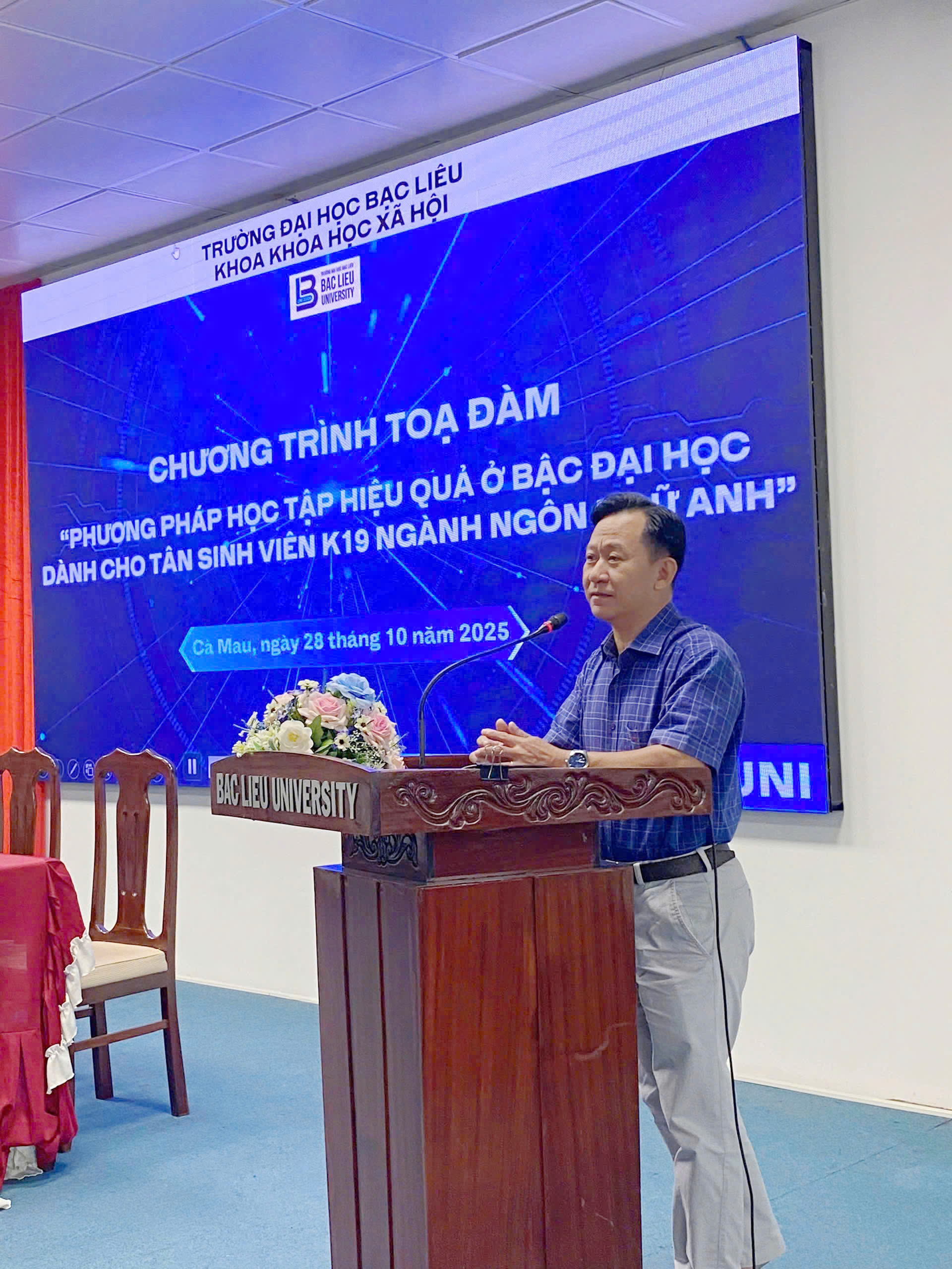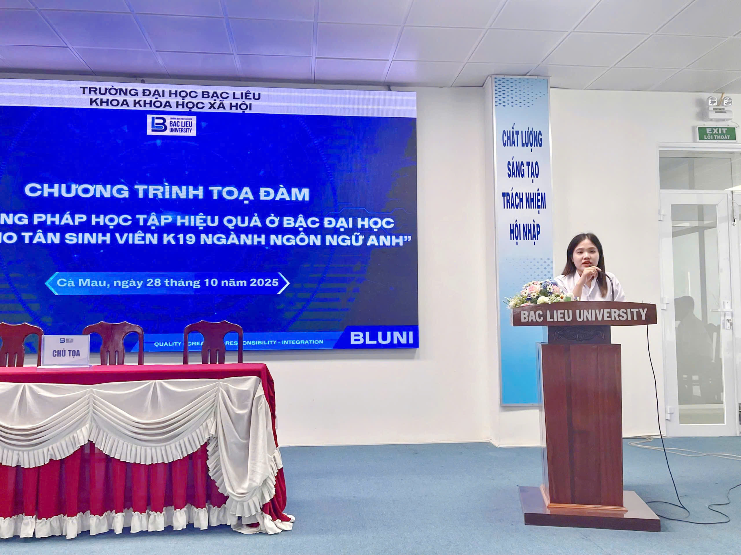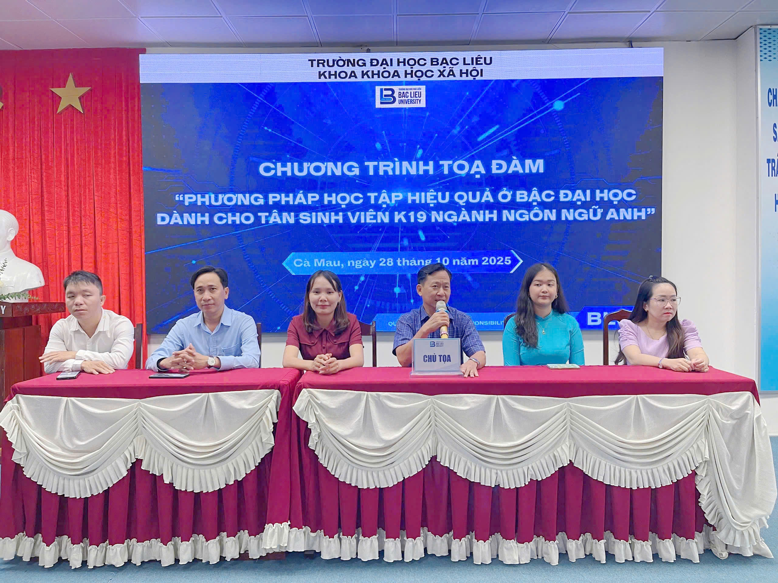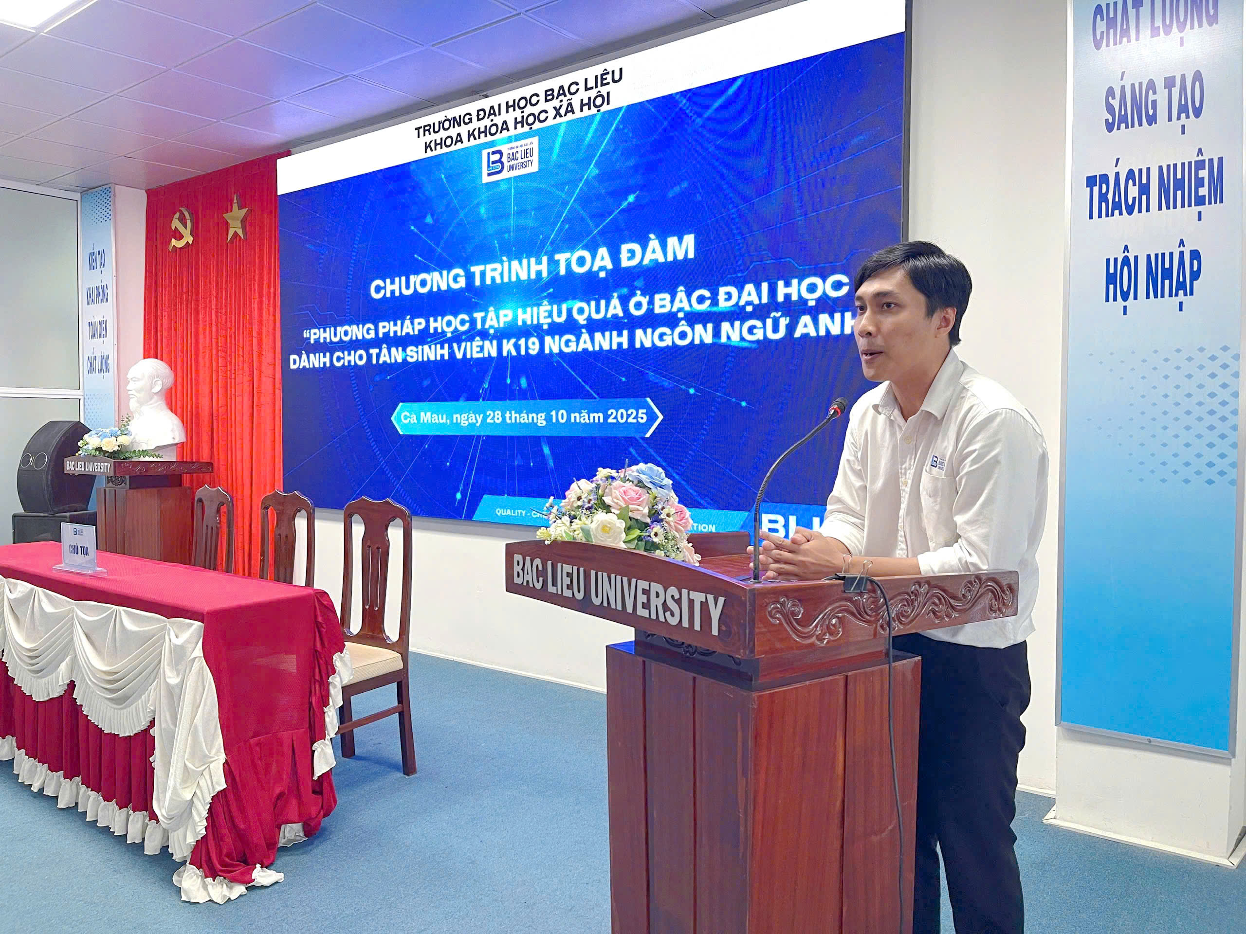 Sáng ngày 28/10/2025, tại Hội trường Nhà Điều hành (Cơ sở 1), Bộ môn Ngoại ngữ – Khoa Khoa học xã hội, Trường Đại học Bạc Liêu đã tổ chức Tọa đàm “Phương pháp học tập hiệu quả ở bậc đại học dành cho tân sinh viên K19 ngành Ngôn ngữ Anh”.