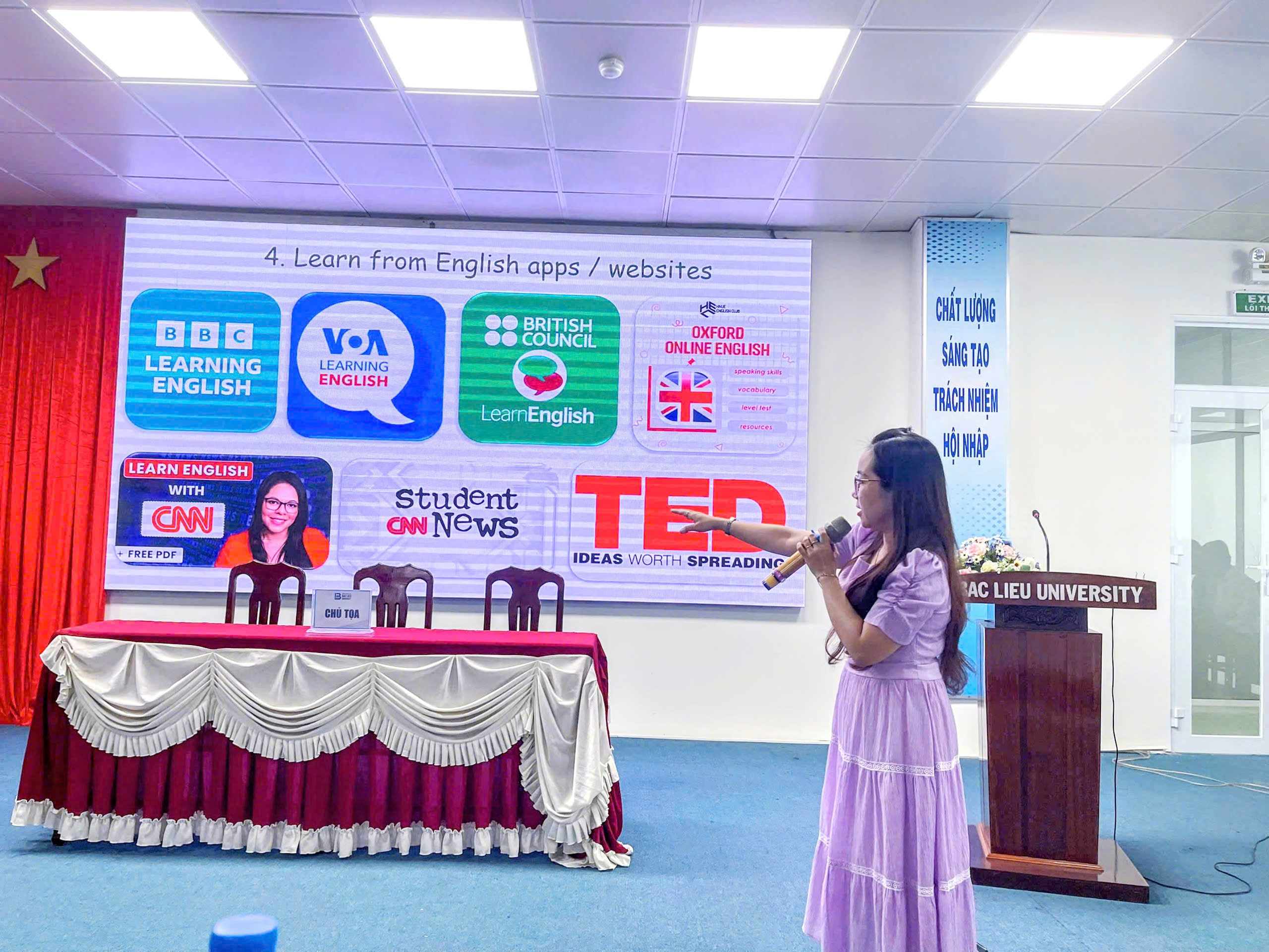 - Tham luận 3: Cô Sầm Ngọc Khả Tú chia sẻ “Kinh nghiệm rèn luyện kỹ năng Nghe - Nói” một cách lưu loát, kèm theo những gợi ý về nguồn tài nguyên phong phú từ các website và ứng dụng học tập.