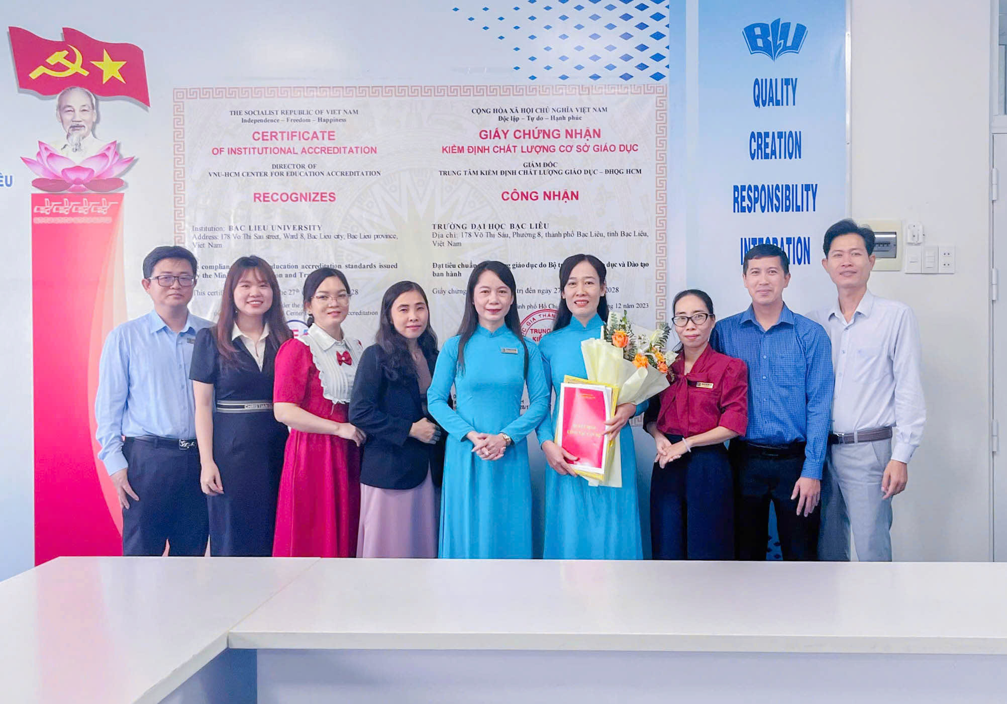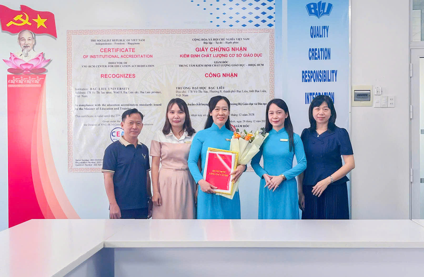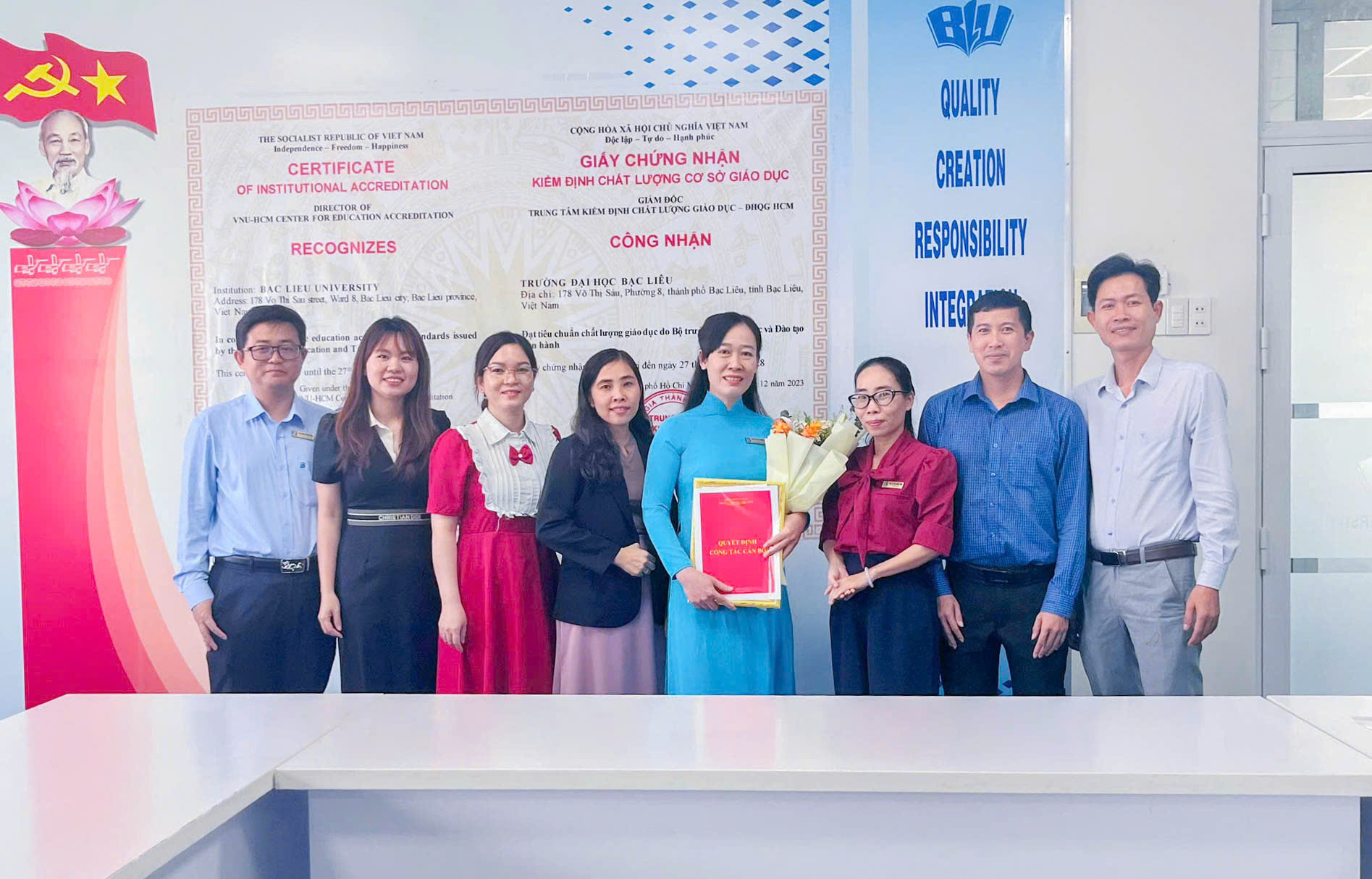 Tại buổi lễ, TS. Trương Thu Trang đã công bố và trao Quyết định Số 707/QĐ-ĐHBL ngày 24/9/2025 của Hiệu trưởng Trường Đại học Bạc Liêu, về việc bổ nhiệm viên chức lãnh đạo quản lý: ThS. Lê Kiều Nương – Phó Trưởng Bộ môn Việt Nam học, được bổ nhiệm giữ chức vụ Trưởng Bộ môn Việt Nam học.